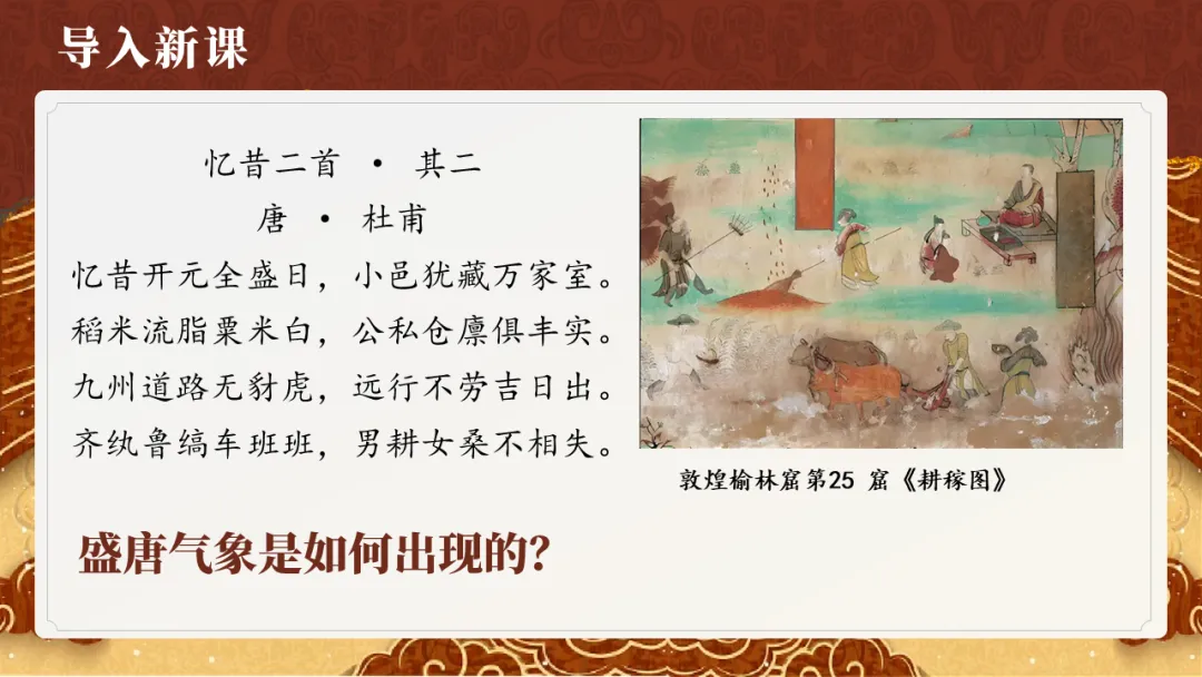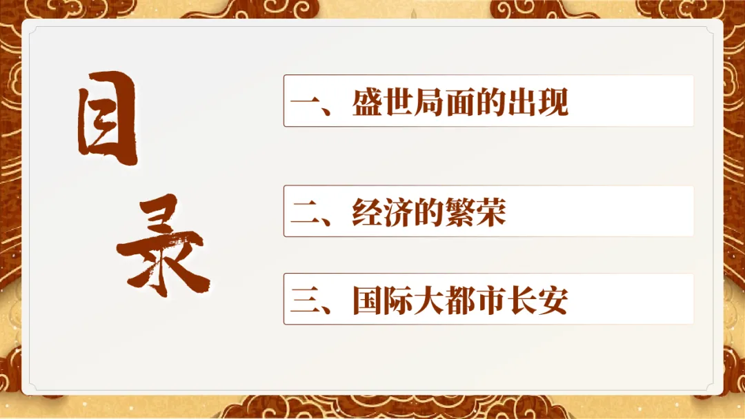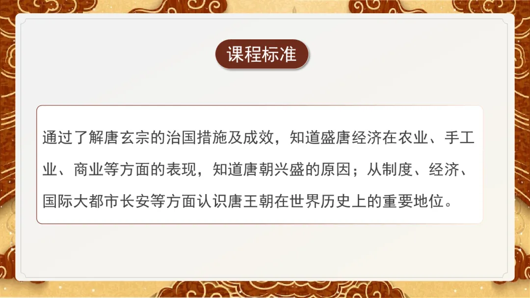2024版新教材课件持续更新中,老师可以咨询客服购买。本次初中历史更新的课件为2024版初中历史七年级下册第3课《开元盛世》,课件共34页。通过了解唐玄宗的治国措施及成效,知道盛唐经济在农业、手工业、商业等方面的表现,知道唐朝兴盛的原因;从制度、经济、国际大都市长安等方面认识唐王朝在世界历史上的重要地位。