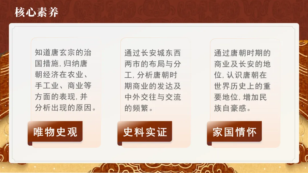 3.家国情怀:通过唐朝时期的商业及长安的地位,认识唐朝在世界历史上的重要地位,增加民族自豪感。