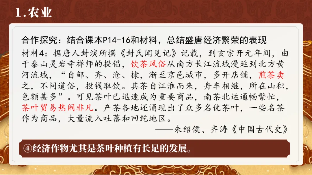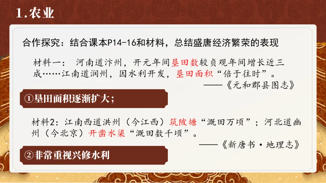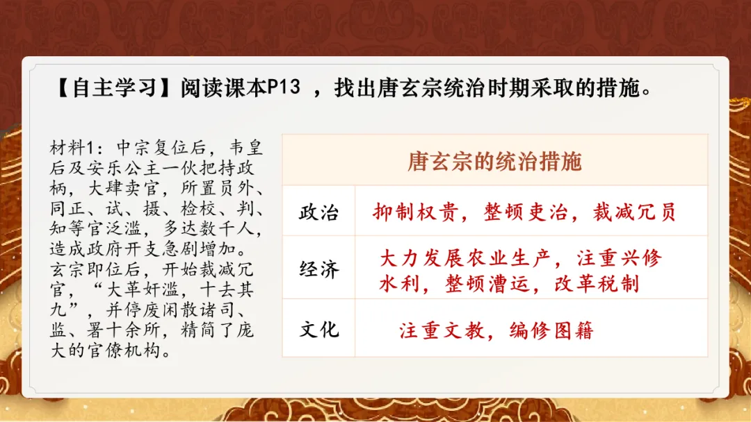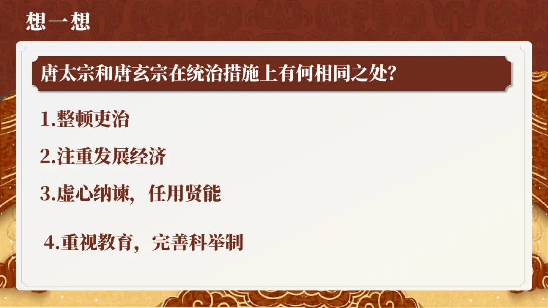 1.唯物史观:知道唐玄宗的治国措施,归纳唐朝经济在农业、手工业、商业等方面的表现,并分析出现的原因。