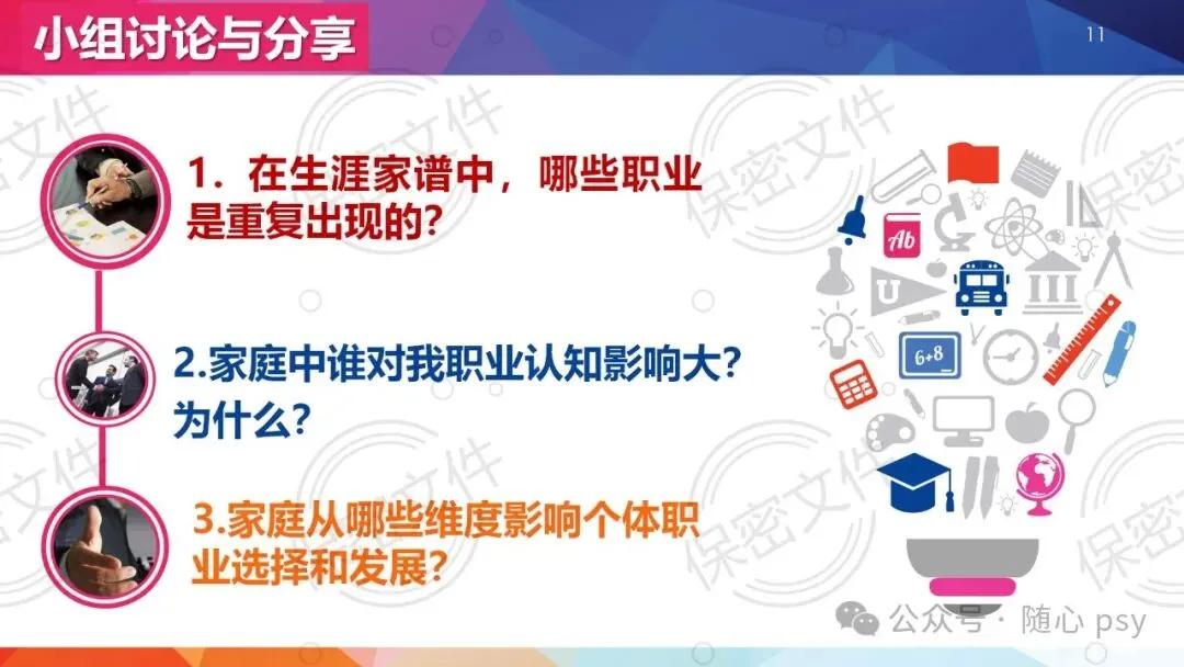 小结:通过刚刚同学们分享,我们能感受到到家族对个体职业选择与发展的影响:从遗传基因到兴趣培养、从性格养成到信念价值观,以及资源人脉等方方面面。
