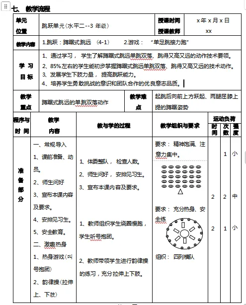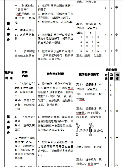 1、重点:学习蹲踞式跳远的单跳双落动作。