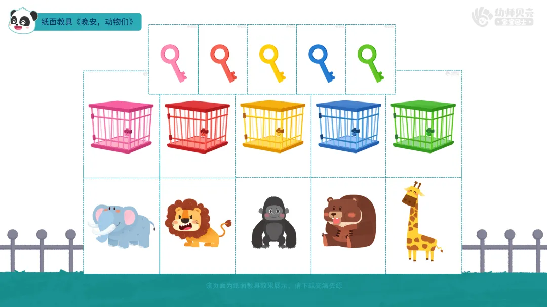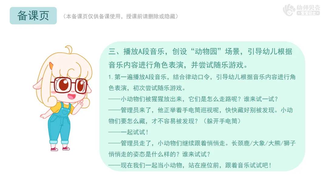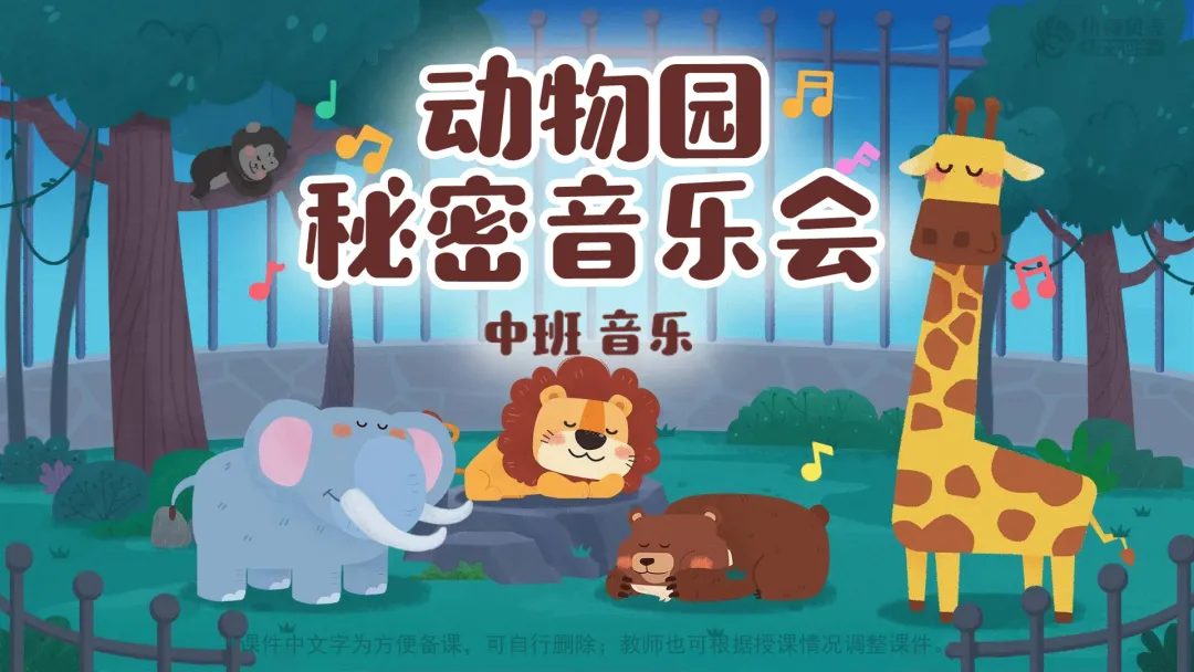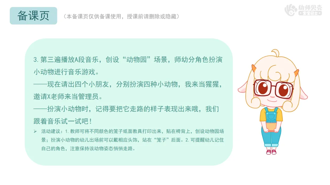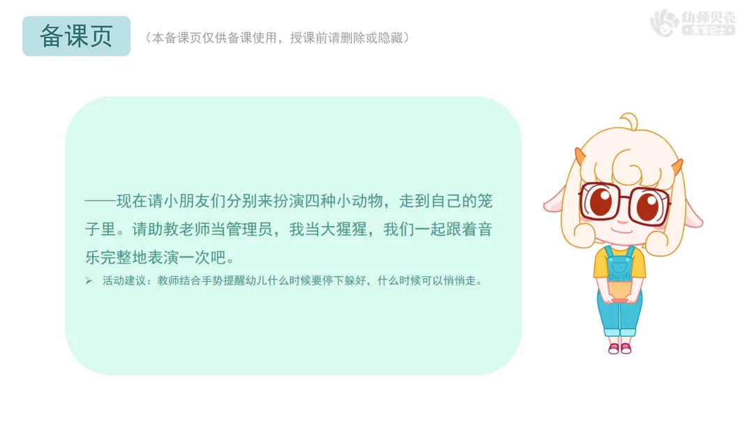 Ø活动建议:1.教师可将不同颜色的笼子纸面教具打印出来,贴在椅背上,创设动物园场景;扮演小动物的幼儿出场前可以戴相应头饰,站在“笼子”后面。2.可提醒幼儿记住自己的角色,注意保持该动物姿态悄悄走路。