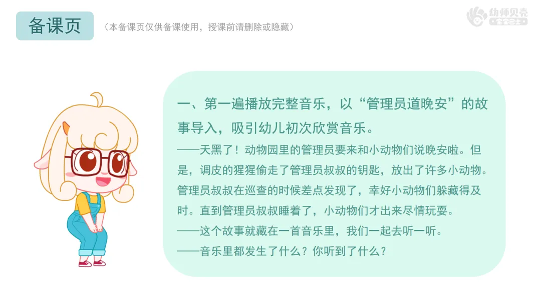 一、第一遍播放完整音乐,以“管理员道晚安”的故事导入,吸引幼儿初次欣赏音乐。——天黑了!动物园里的管理员要来和小动物们说晚安啦。可调皮的猩猩却偷偷拿走了他的钥匙,放出了许多小动物。管理员叔叔在巡查的时候差点发现了它们,幸好小动物们躲藏得及时。直到管理员叔叔睡着了,小动物们才出来尽情玩耍。
