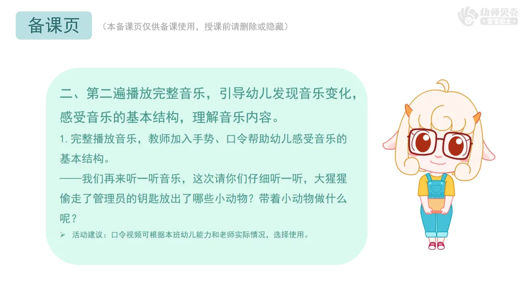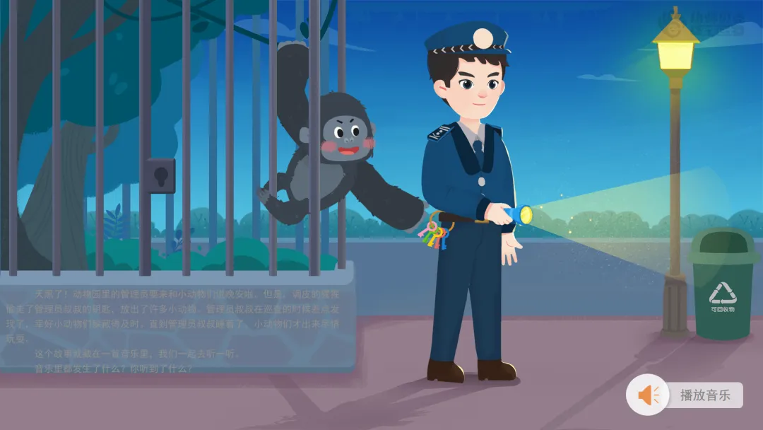 ——我们再来听一听音乐,这次请你们仔细听一听,大猩猩偷走了管理员的钥匙放出了哪些小动物?带着小动物做什么呢?