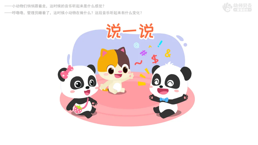 ——你听到了什么?(呼噜声)这时候小动物们又在干什么呢?(跳舞、玩耍)