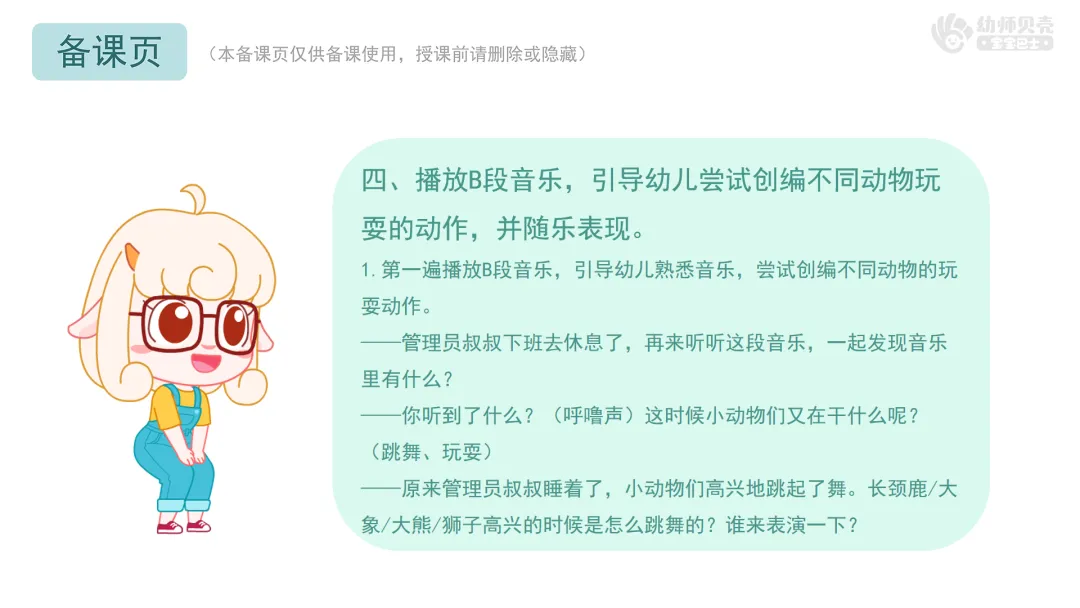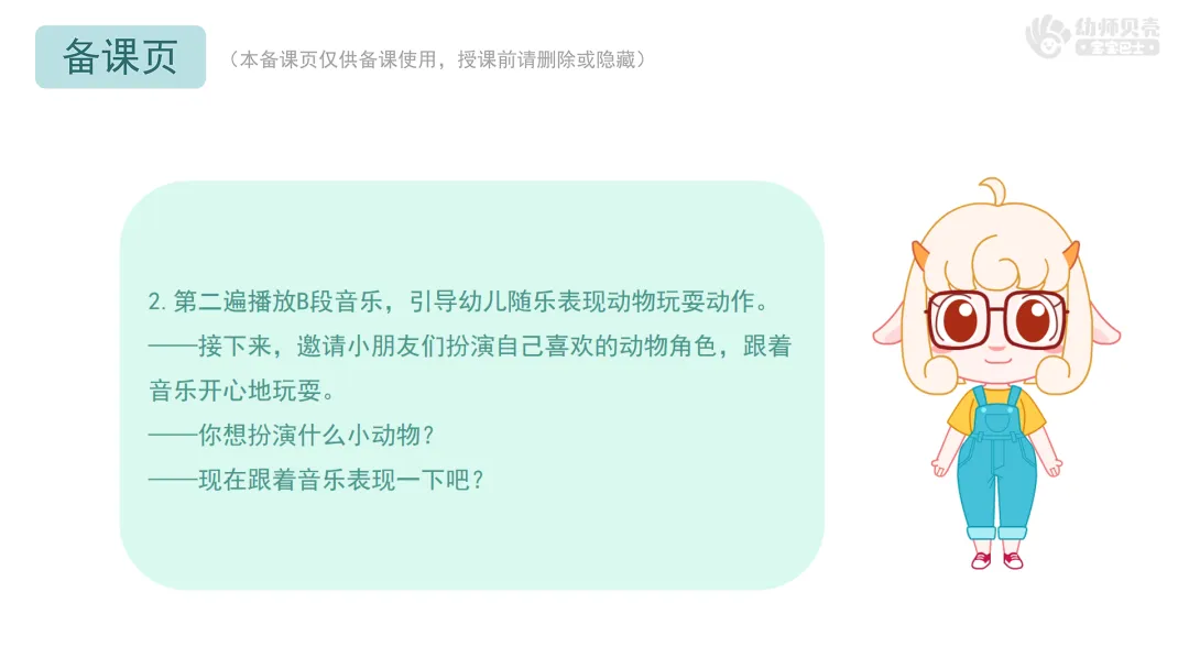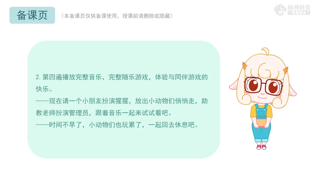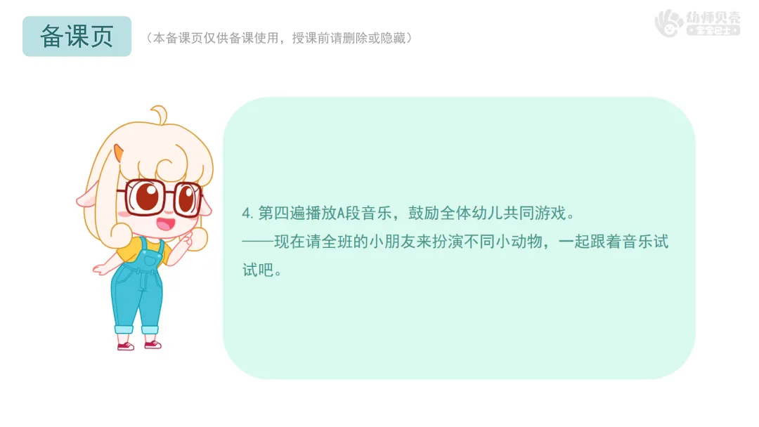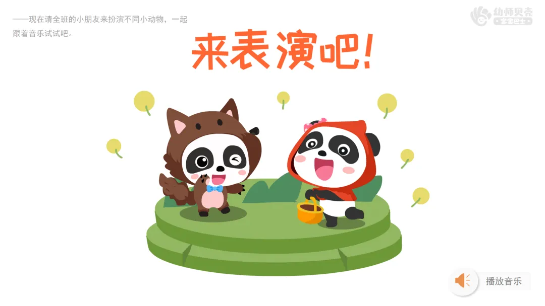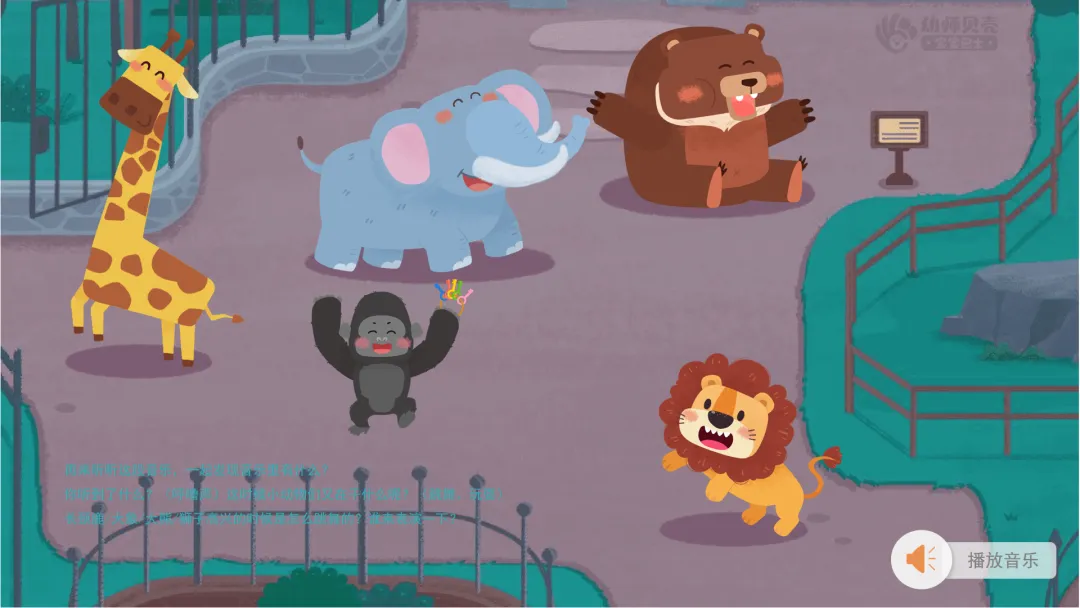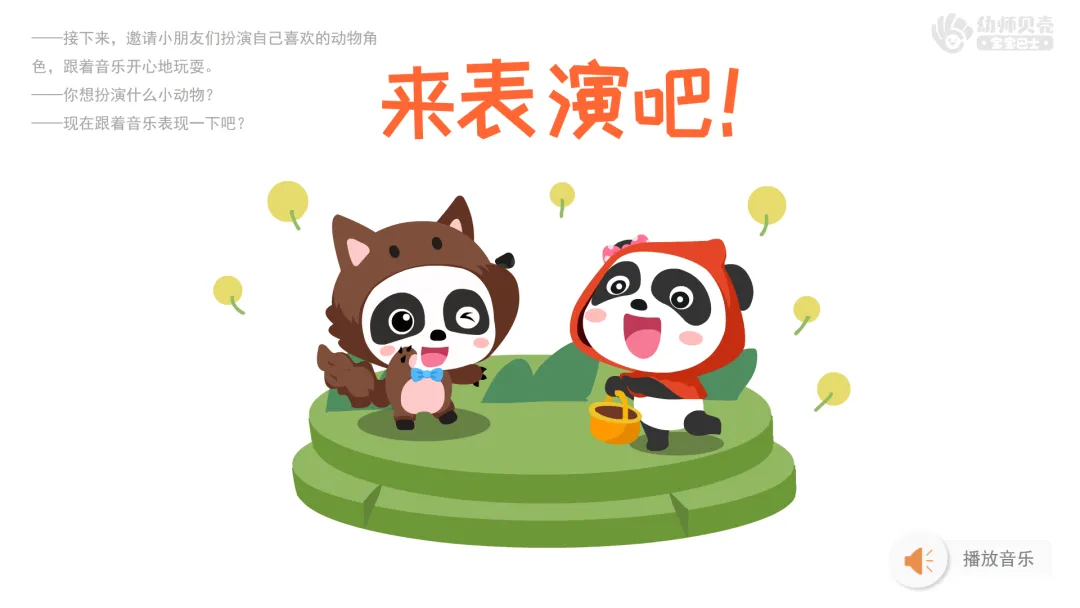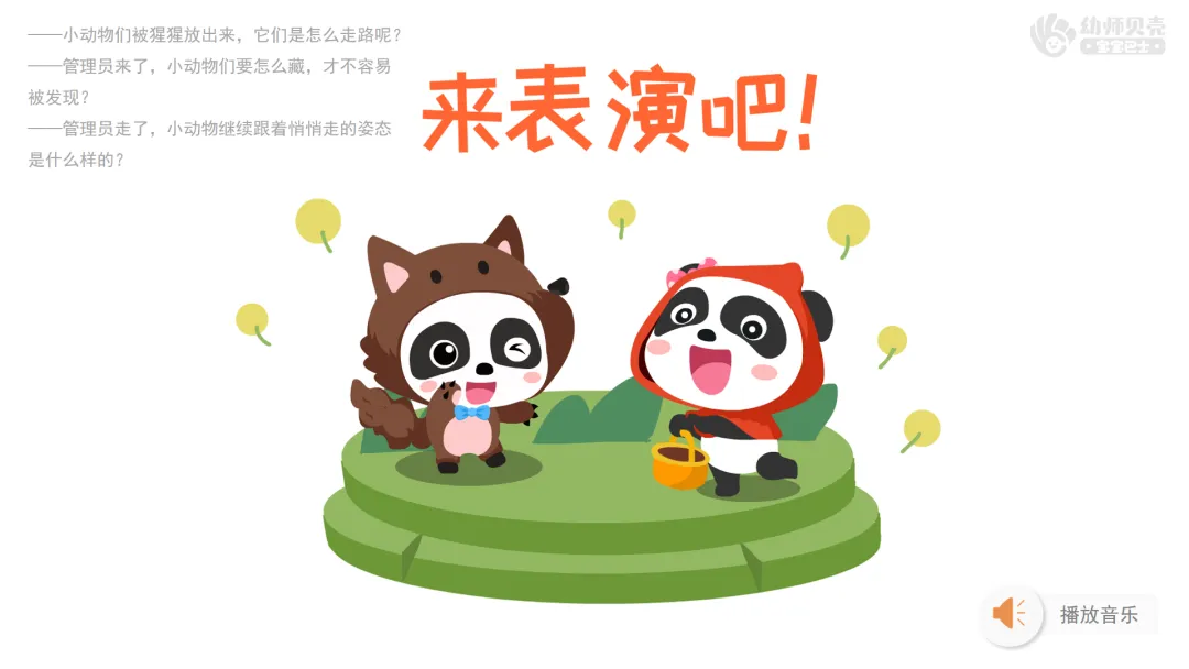 ——接下来,邀请小朋友们扮演自己喜欢的动物角色,跟着音乐开心地玩耍。