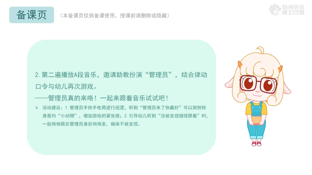 Ø活动建议:1.管理员手持手电筒进行巡逻,听到“管理员来了快藏好”可以突然转身面向“小动物”,增加游戏的紧张感;2.引导幼儿听到“没被发现继续跟着”时,一起悄悄跟在管理员身后悄悄走,确保不被发现。