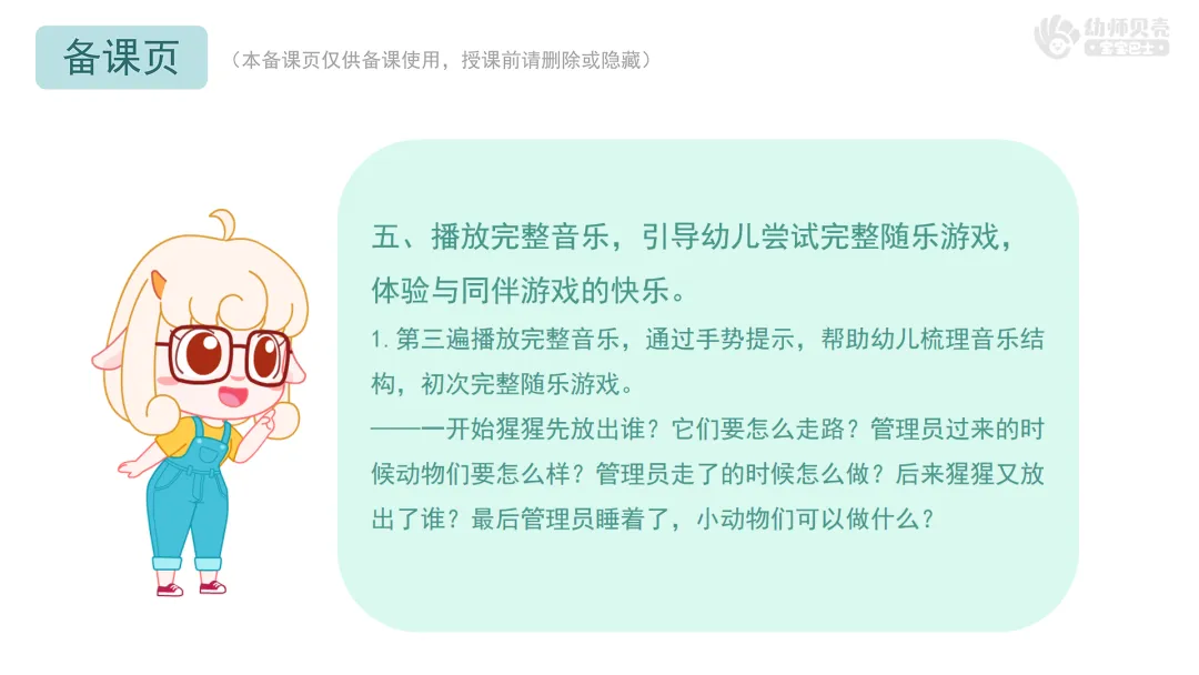 ——现在请一个小朋友扮演猩猩,放出小动物们悄悄走,助教老师扮演管理员,跟着音乐一起来试试看吧。