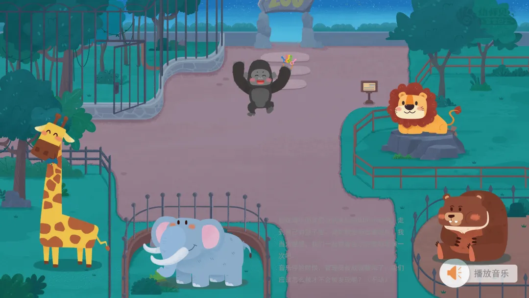 ——现在请小朋友们分别来扮演四种小动物,走到自己的笼子里。请助教老师当管理员,我当大猩猩,我们一起跟着音乐完整地表演一次吧。