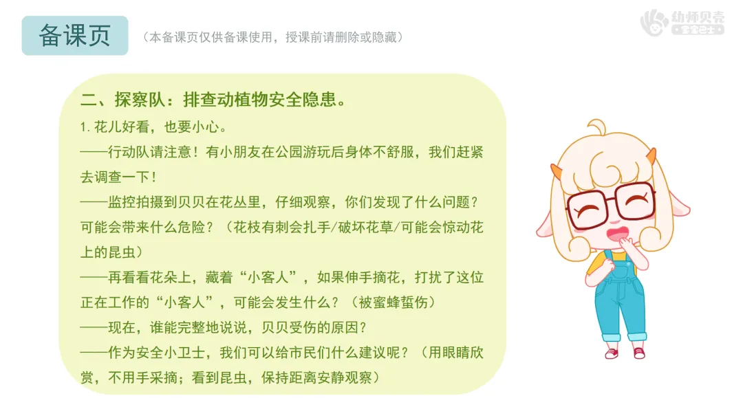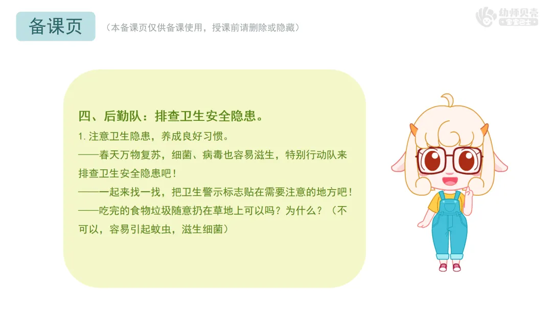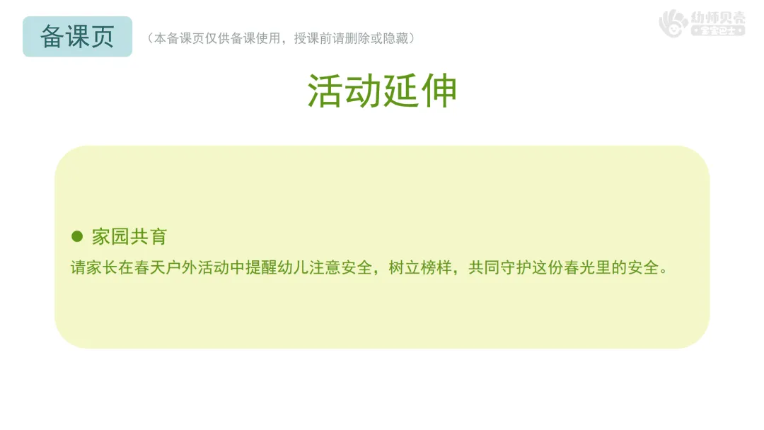 l重点:了解春天活动中的安全注意事项,并能与同伴进行讨论和分享。