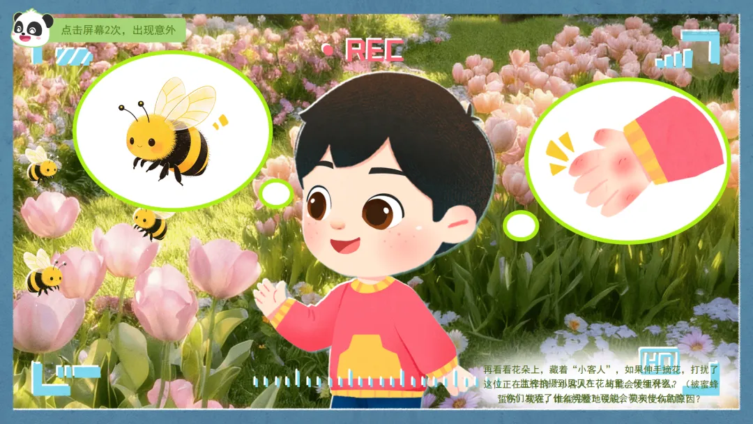 ——再看看花朵上,藏着“小客人”,如果伸手摘花,打扰了这位正在工作的“小客人”,可能会发生什么?(被蜜蜂蜇伤)