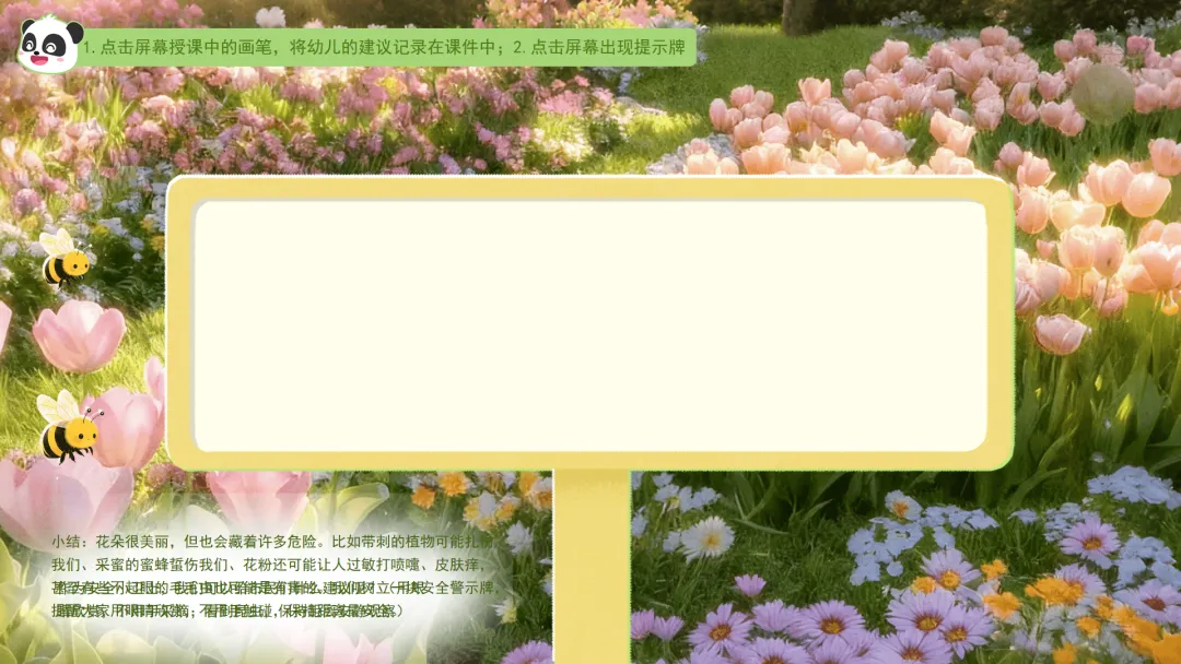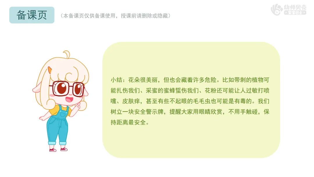 小结:花朵很美丽,但也会藏着许多危险。比如带刺的植物可能扎伤我们、采蜜的蜜蜂蜇伤我们、花粉还可能让人过敏打喷嚏、皮肤痒,甚至有些不起眼的毛毛虫也可能是有毒的。我们树立一块安全警示牌,提醒大家用眼睛欣赏,不用手触碰,保持距离最安全。