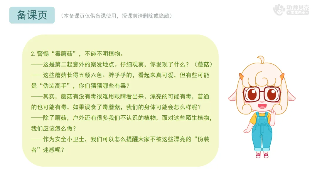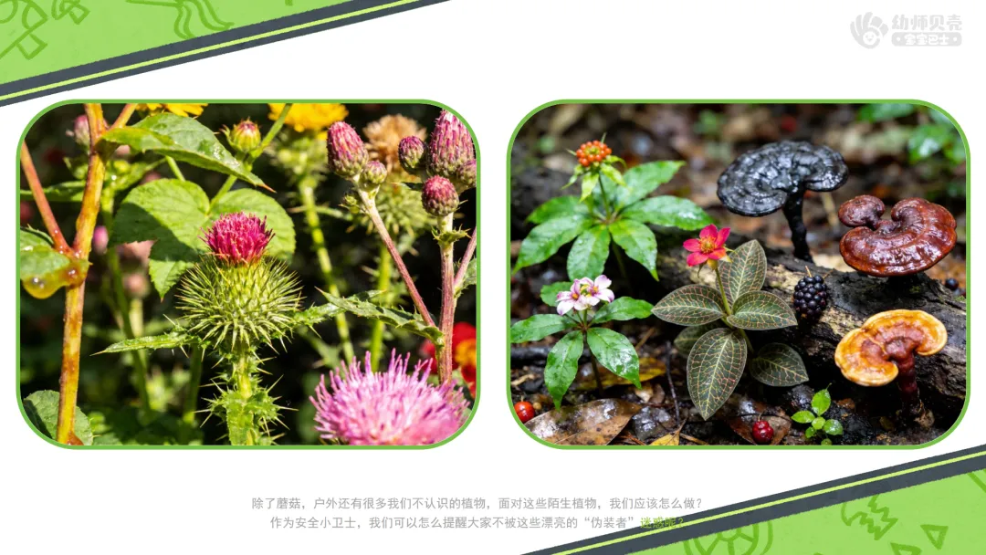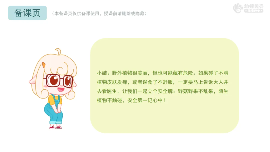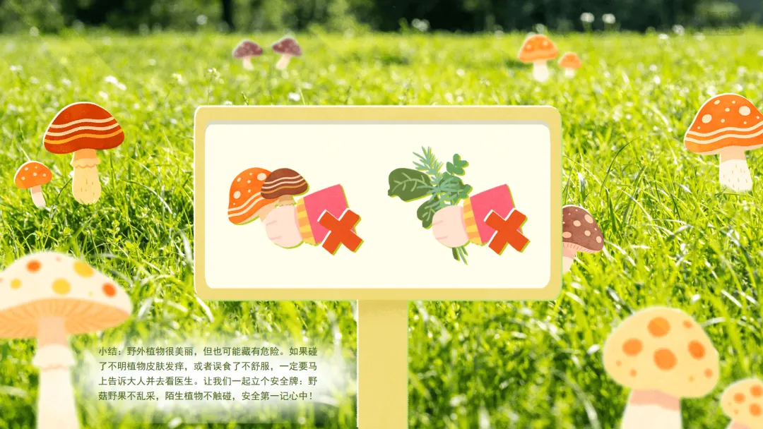 小结:野外植物很美丽,但也可能藏有危险。如果碰了不明植物皮肤发痒,或者误食了不舒服,一定要马上告诉大人并去看医生。让我们一起立个安全牌:野菇野果不乱采,陌生植物不触碰,安全第一记心中!