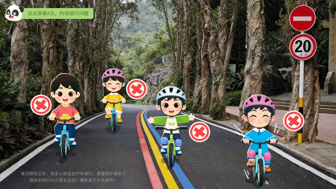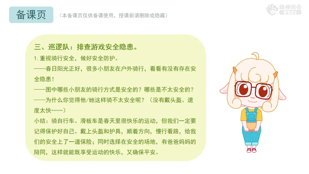 小结:骑自行车、滑板车是春天里很快乐的运动,但我们一定要记得保护好自己。戴上头盔和护具,顺着方向,慢行看路,给我们的安全上了一道保险;同时选择在安全的场地,有爸爸妈妈的陪同,这样就能既享受运动的快乐,又确保平安。