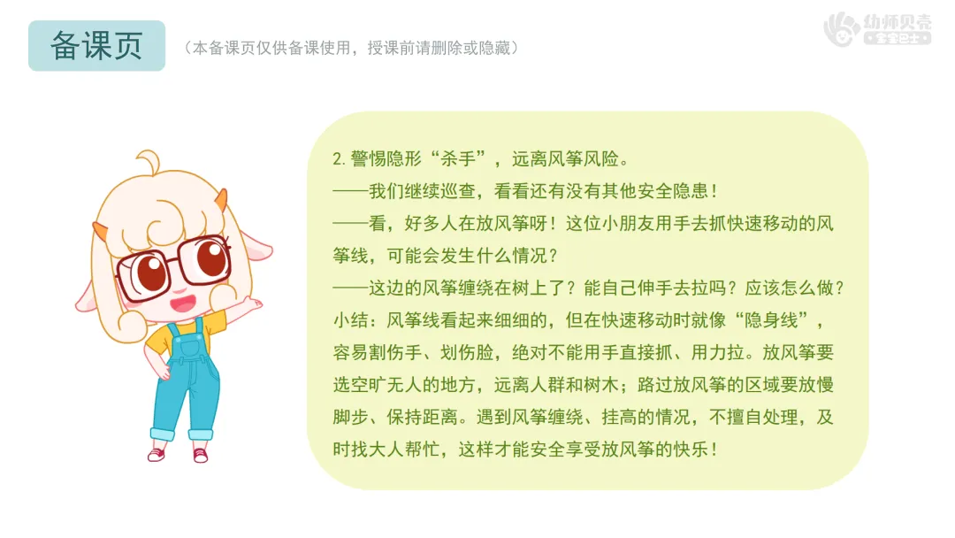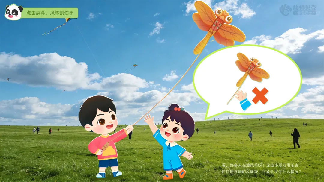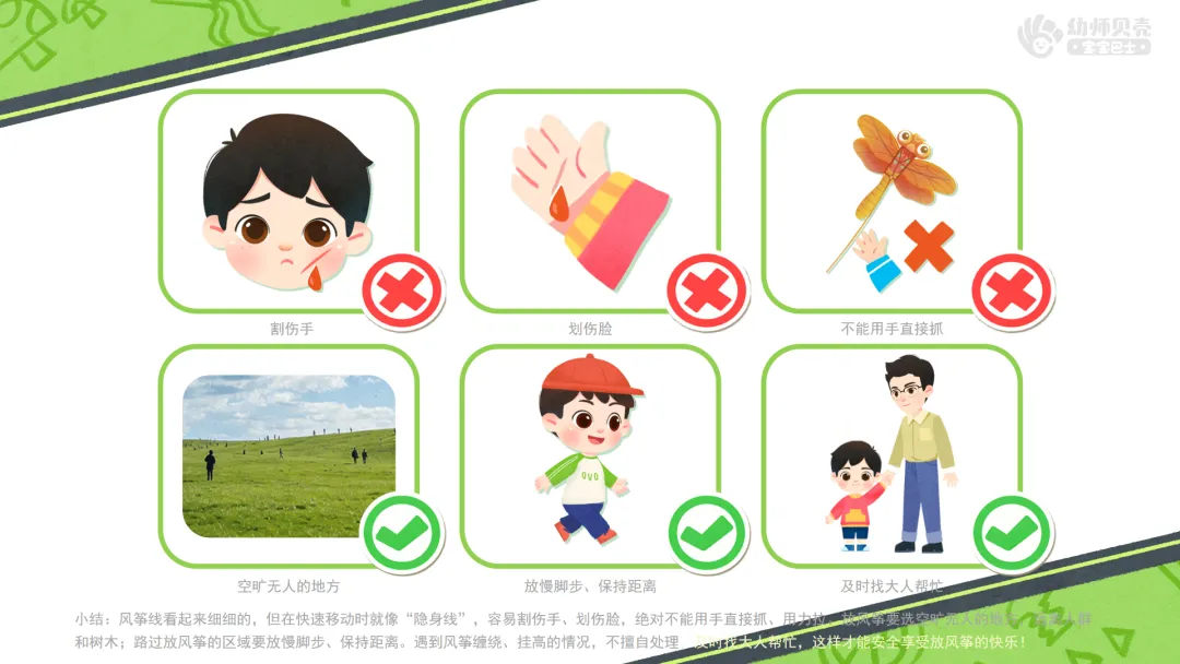 小结:风筝线看起来细细的,但在快速移动时就像“隐身线”,容易割伤手、划伤脸,绝对不能用手直接抓、用力拉。放风筝要选空旷无人的地方,远离人群和树木;路过放风筝的区域要放慢脚步、保持距离。遇到风筝缠绕、挂高的情况,不擅自处理,及时找大人帮忙,这样才能安全享受放风筝的快乐!