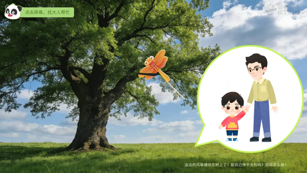 ——这边的风筝缠绕在树上了?能自己伸手去拉吗?应该怎么做?