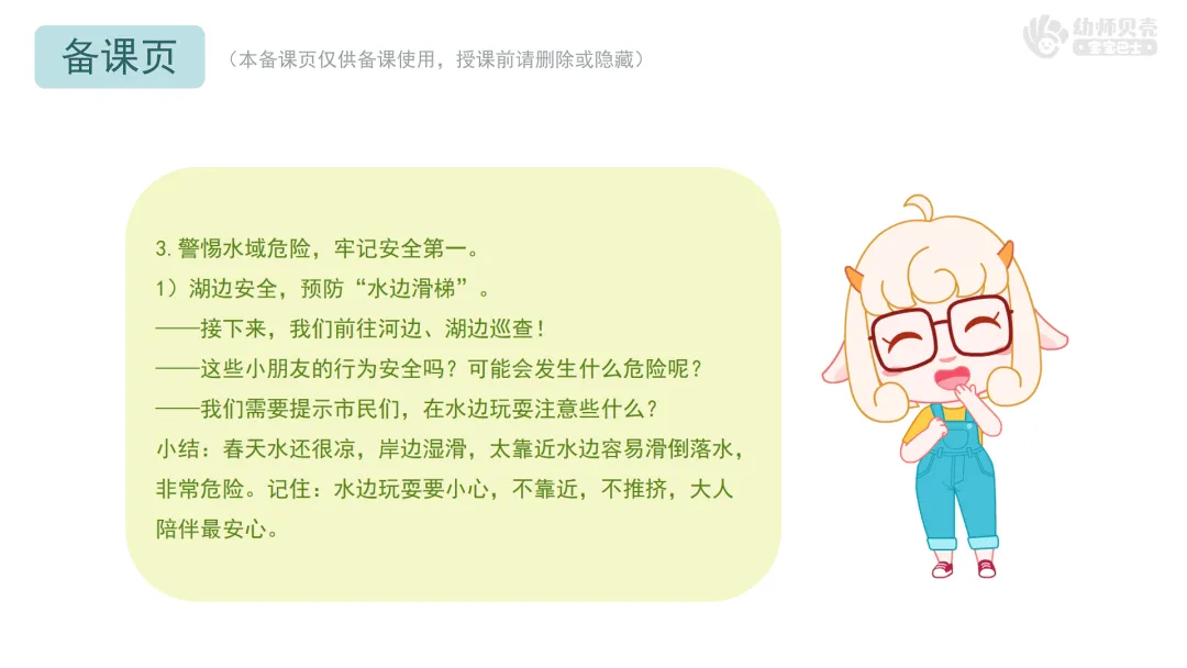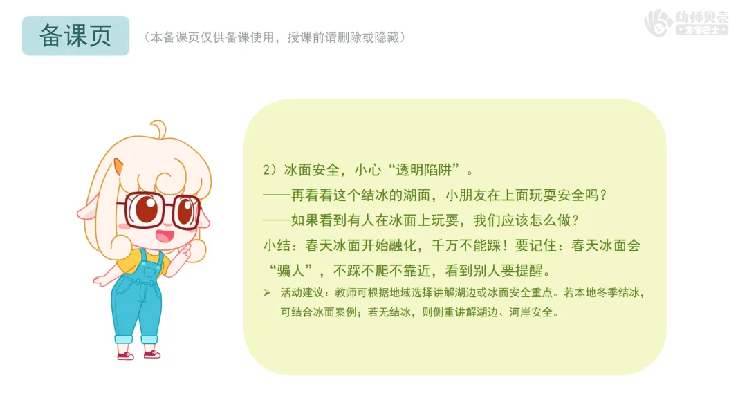 Ø活动建议:教师可根据地域选择讲解湖边或冰面安全重点。若本地冬季结冰,可结合冰面案例;若无结冰,则侧重讲解湖边、河岸安全。