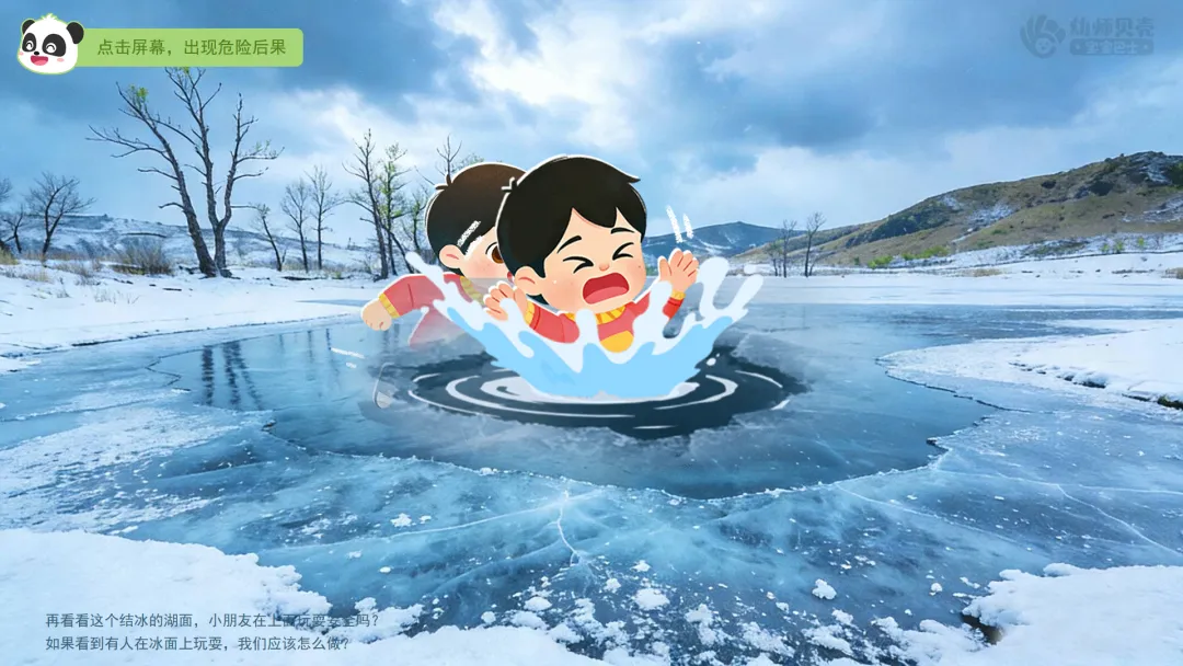 ——再看看这个结冰的湖面,小朋友在上面玩耍安全吗?