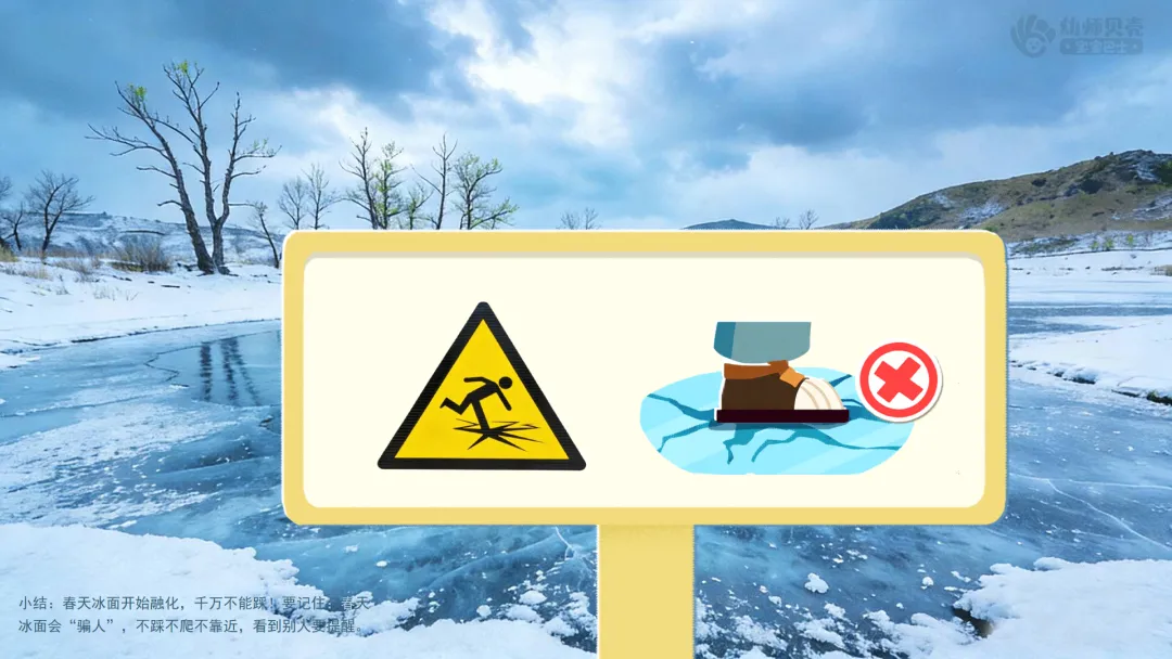 小结:春天冰面开始融化,千万不能踩!要记住:春天冰面会“骗人”,不踩不爬不靠近,看到别人要提醒。