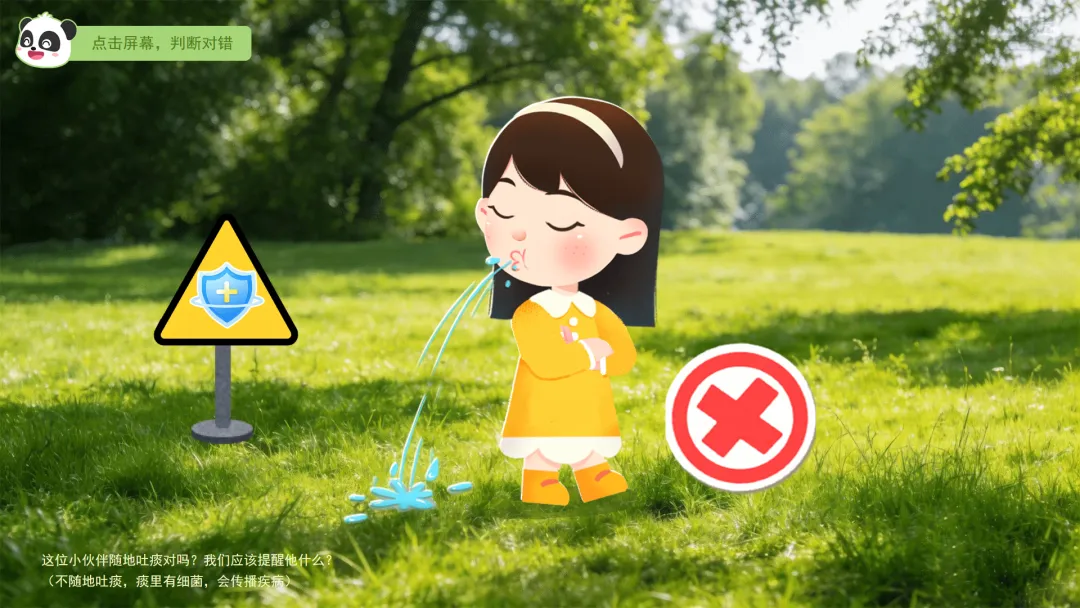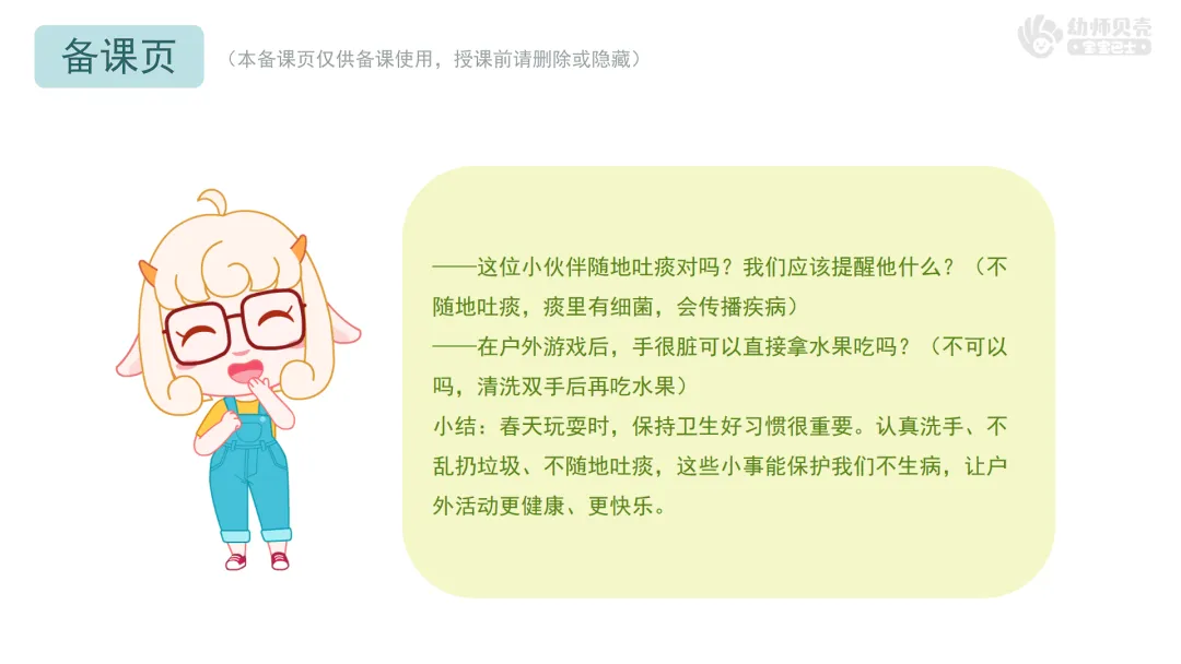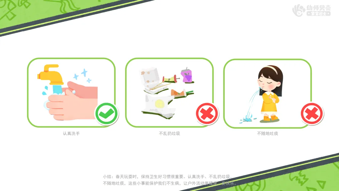 小结:春天玩耍时,保持卫生好习惯很重要。认真洗手、不乱扔垃圾、不随地吐痰,这些小事能保护我们不生病,让户外活动更健康、更快乐。