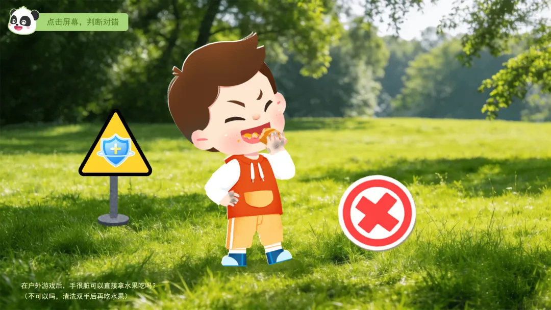 ——在户外游戏后,想要吃水果时,要怎么做?(清洗双手后再吃水果)