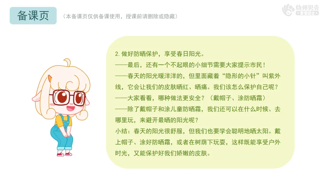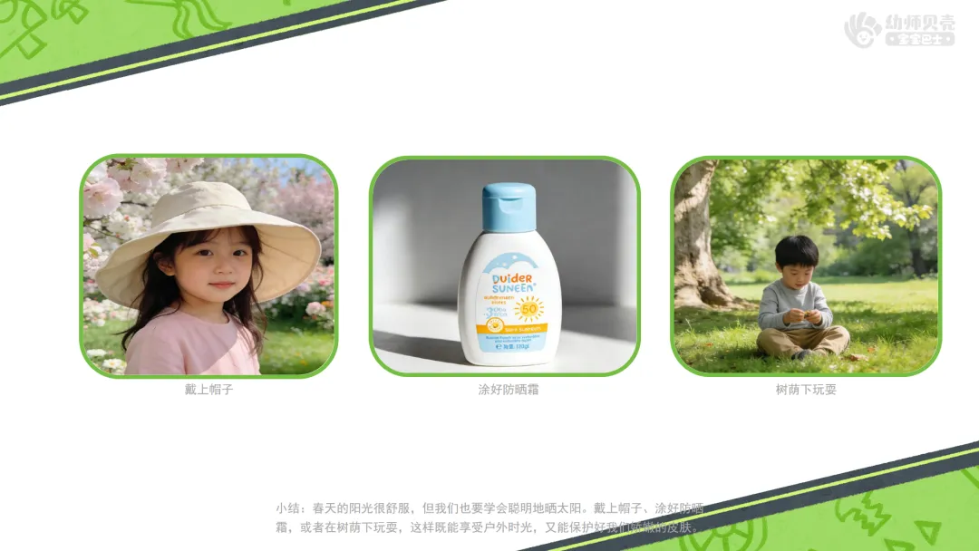 小结:春天的阳光很舒服,但我们也要学会聪明地晒太阳。戴上帽子、涂好防晒霜,或者在树荫下玩耍,这样既能享受户外时光,又能保护好我们娇嫩的皮肤。