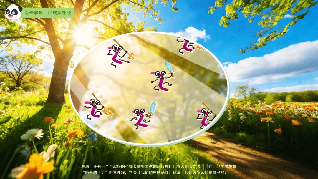 ——春天的阳光暖洋洋的,但里面藏着“隐形的小针”叫紫外线,它会让我们的皮肤晒红、晒痛。我们该怎么保护自己呢?