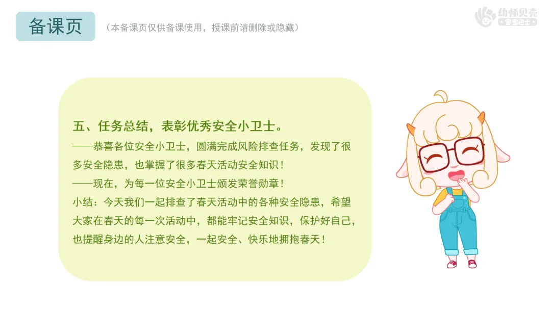 小结:今天我们一起排查了春天活动中的各种安全隐患,希望大家在春天的每一次活动中,都能牢记安全知识,保护好自己,也提醒身边的人注意安全,一起安全、快乐地拥抱春天!