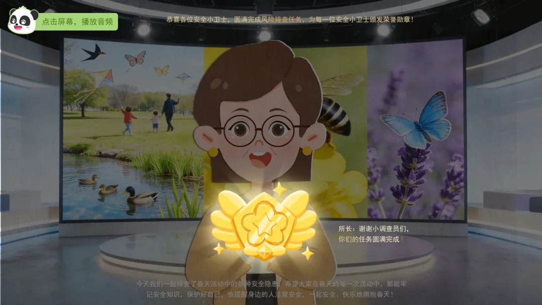——恭喜各位安全小卫士,圆满完成风险排查任务,发现了很多安全隐患,也掌握了很多春天活动安全知识!