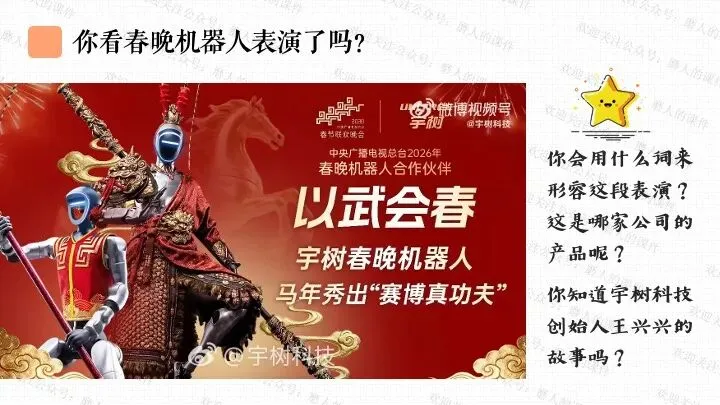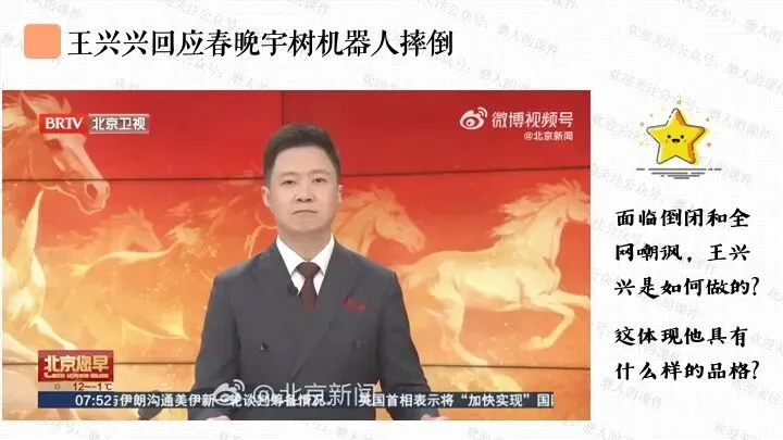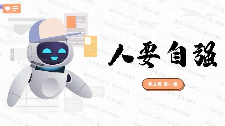 本课以宇树科技王兴兴的故事一案到底。从“宇树科技机器人春晚表演”导入课题;通过王兴兴初中是偏科少年、宇树科技创业初期的困境、宇树机器人现实应用、德国总理参访宇树科技等,穿插课堂活动,学习人要自强。最后呈现本课的知识框架。课件逻辑清晰,素材丰富,兼具知识讲授和价值引导。