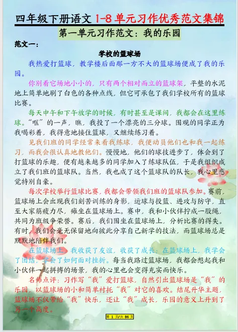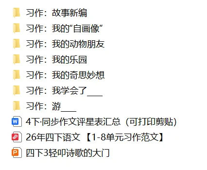 如果需要四年级语文下册1-8单元作文课件PPT+教案+评星表+范文+点评+习作单(PDF版,可打印)》
