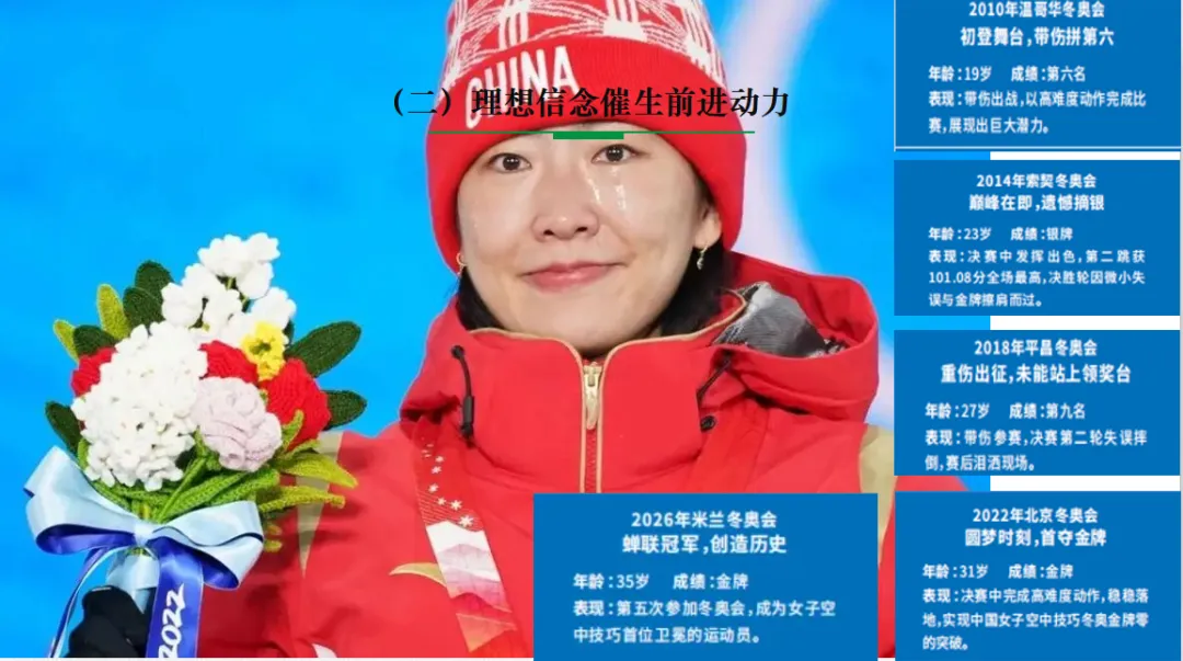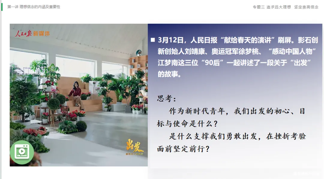 课堂以视频“献给春天的故事:出发”作为导入,引导学生思考,作为刚迈入大学的青年,出发的方向在哪里,通过这种方式,让学生在直观体验中产生情感共鸣,为探讨理想信念的核心作用做好铺垫。”