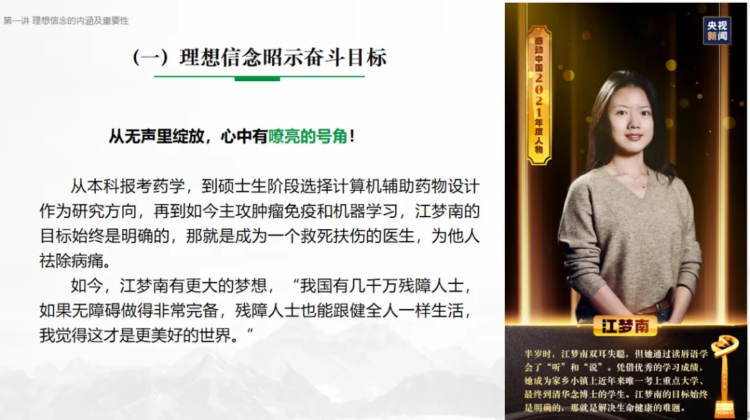 理想信念是中国共产党的政治灵魂,也是最有力的“防腐剂”;对每个人而言,更是精神上的“钙”。在专题三《追求远大理想 坚定崇高信念》中,第1讲《理想信念的内涵及重要性》主要旨在引导学生认识理想信念对个人成长成才的重要作用,从而树立崇高的理想信念。教学设计上,本讲以问题教学法为主,通过新时代青年的案例贯穿全程,使学生直观感受到理想信念是人的精神核心,必须将个人奋斗与国家和民族的前途命运紧密联系。只有这样,理想信念之花才能结出丰硕的成长成才之果。