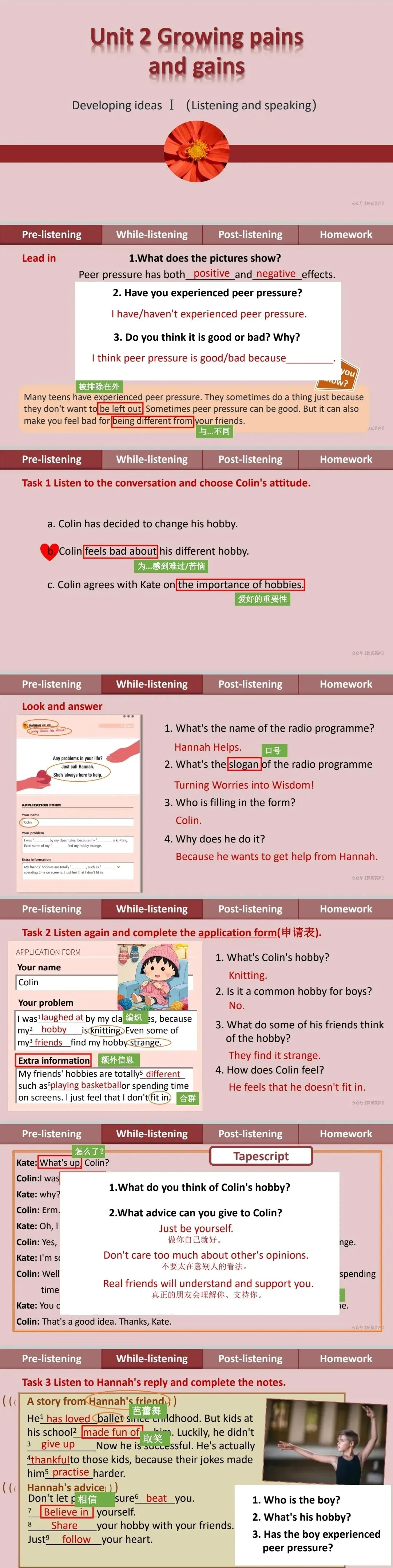 今天开始上第二单元了,用Starting out 的课件上课,学生们都很认真,关于成长的话题他们真的有很多想分享的😁今天更新的是新外研版八下 U2 Developing ideas Ⅰ(Listening and speaking)的课件,不是什么高大上的公开课课件,而是常规课件,但是绝对实用。承诺仅自学使用,不可商用或者转售。