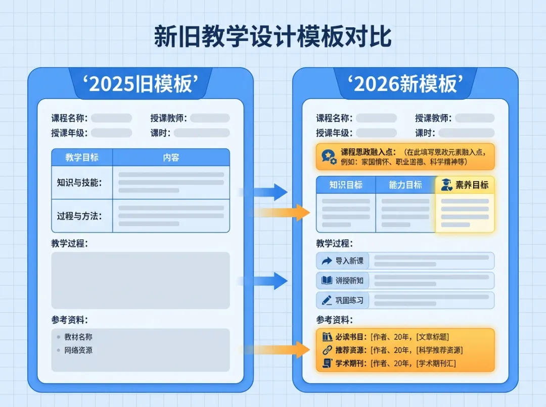 你打开旧教案,对着新模板一项项改——教学目标要分"知识目标""能力目标""素养目标"三栏,课时分配要对齐教学日历,参考文献格式也变了……