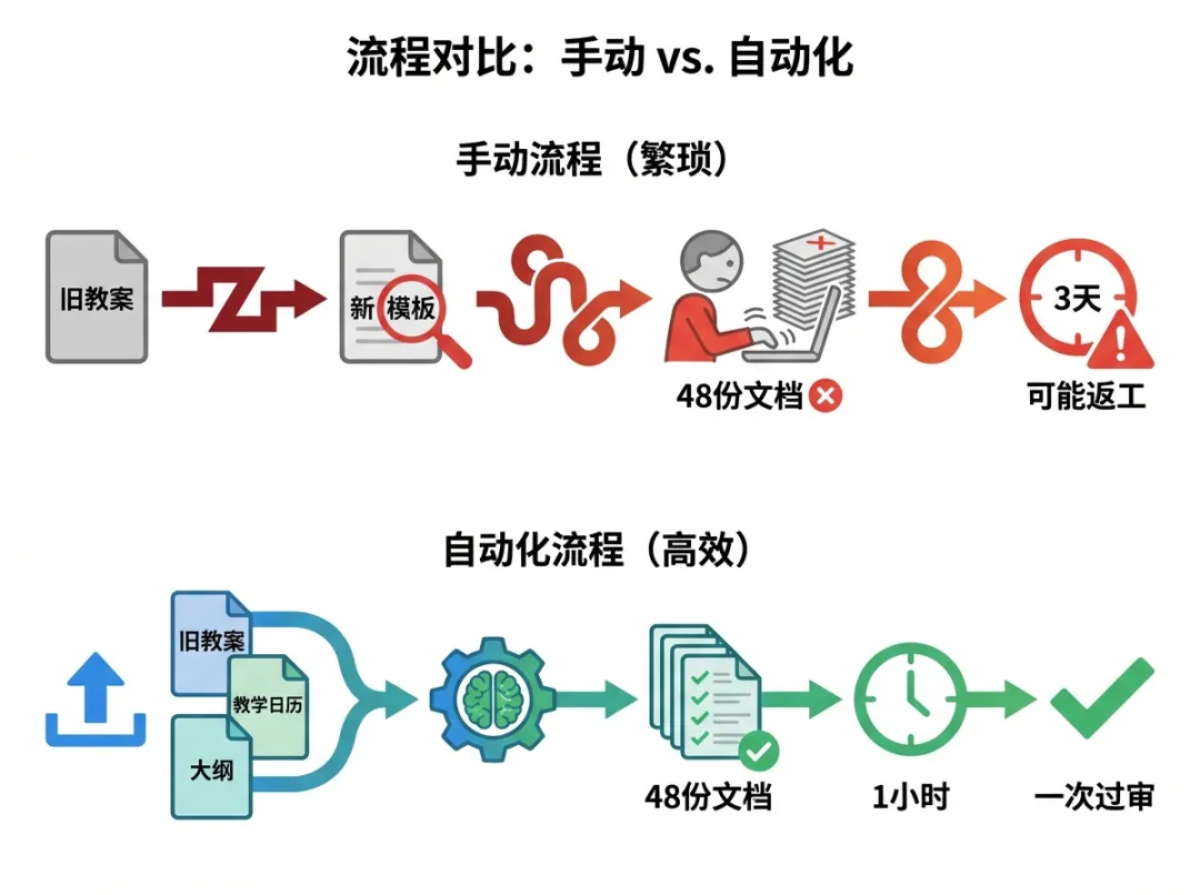 本质上还是人在一份份改。48份教案,每份检查10个格式字段,就是480次核对。改错一个,教务处退回来又是一轮。