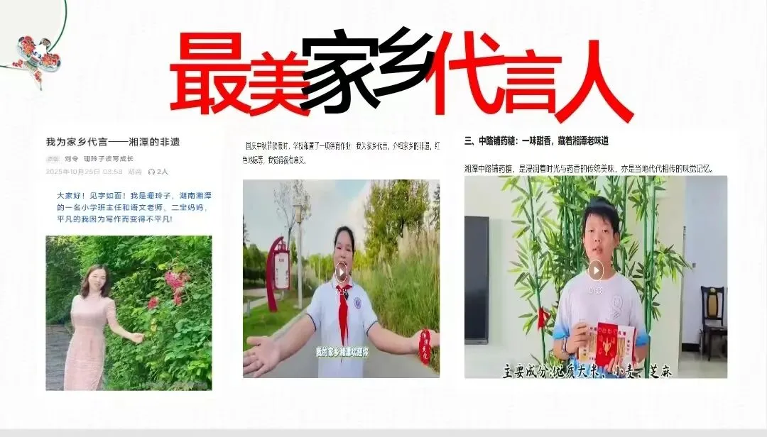 1、前段时间我们班几位孩子参加了“最美家乡代言人”的德育活动,用视频分享了湘潭的非遗文化。这节课我们用文字为家乡代言,一起来评改第一单元的作文,评选出“家乡风俗”最美代言人。