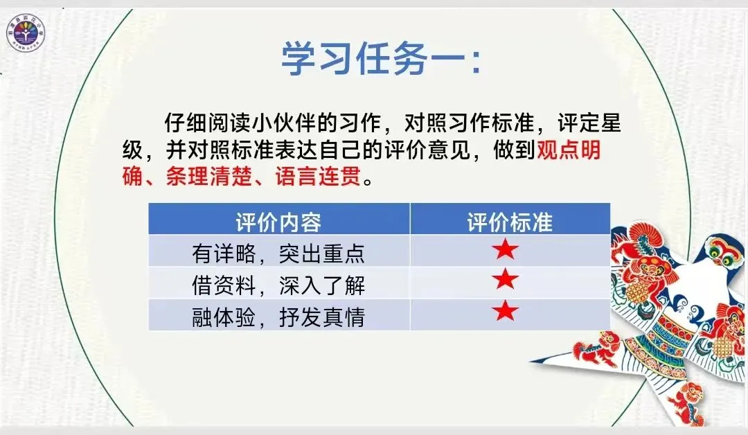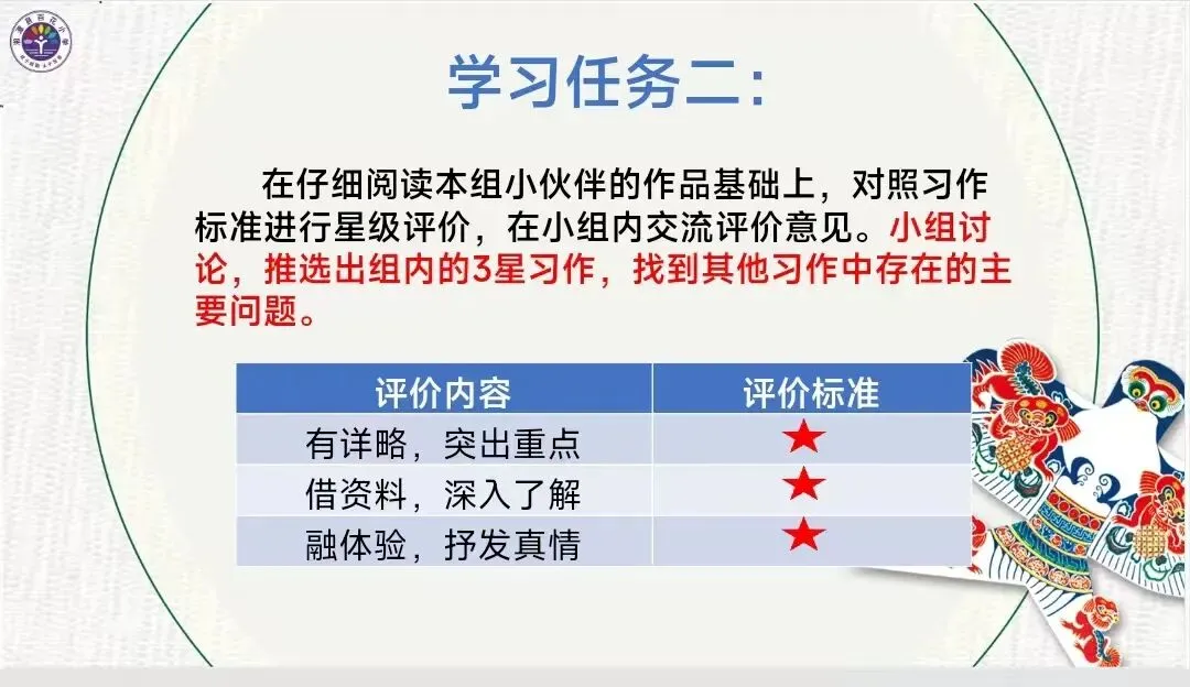 学习任务:对照习作标准,每个小组推选出组内的3星习作。学习时间:3分钟