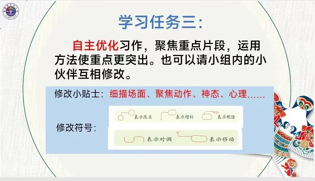 课堂中,学生自主评价精准到位,小组交流充分,分层作业设计让不同学生都有展示机会,目标达成度较高。但也存在不足:示范修改的符号示范不足,部分学生在细节与场面描写上仍需多次突破训练。