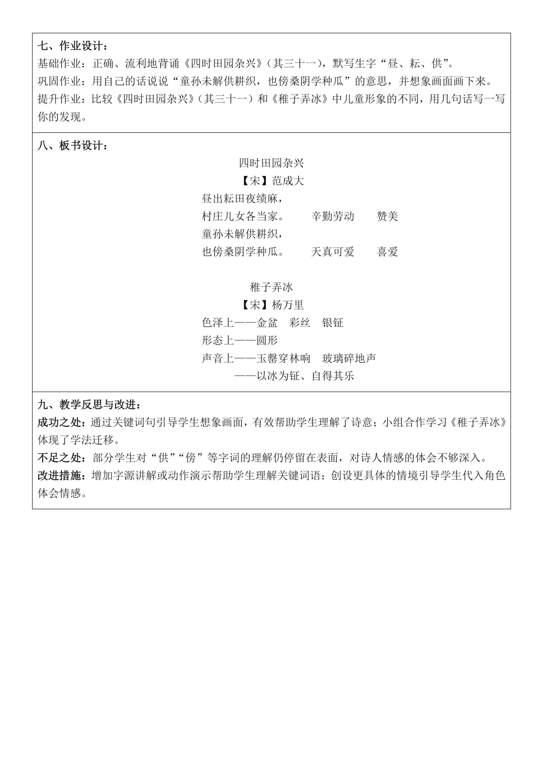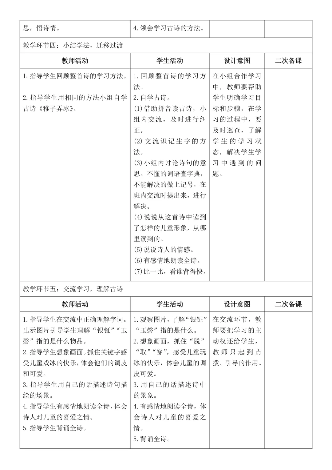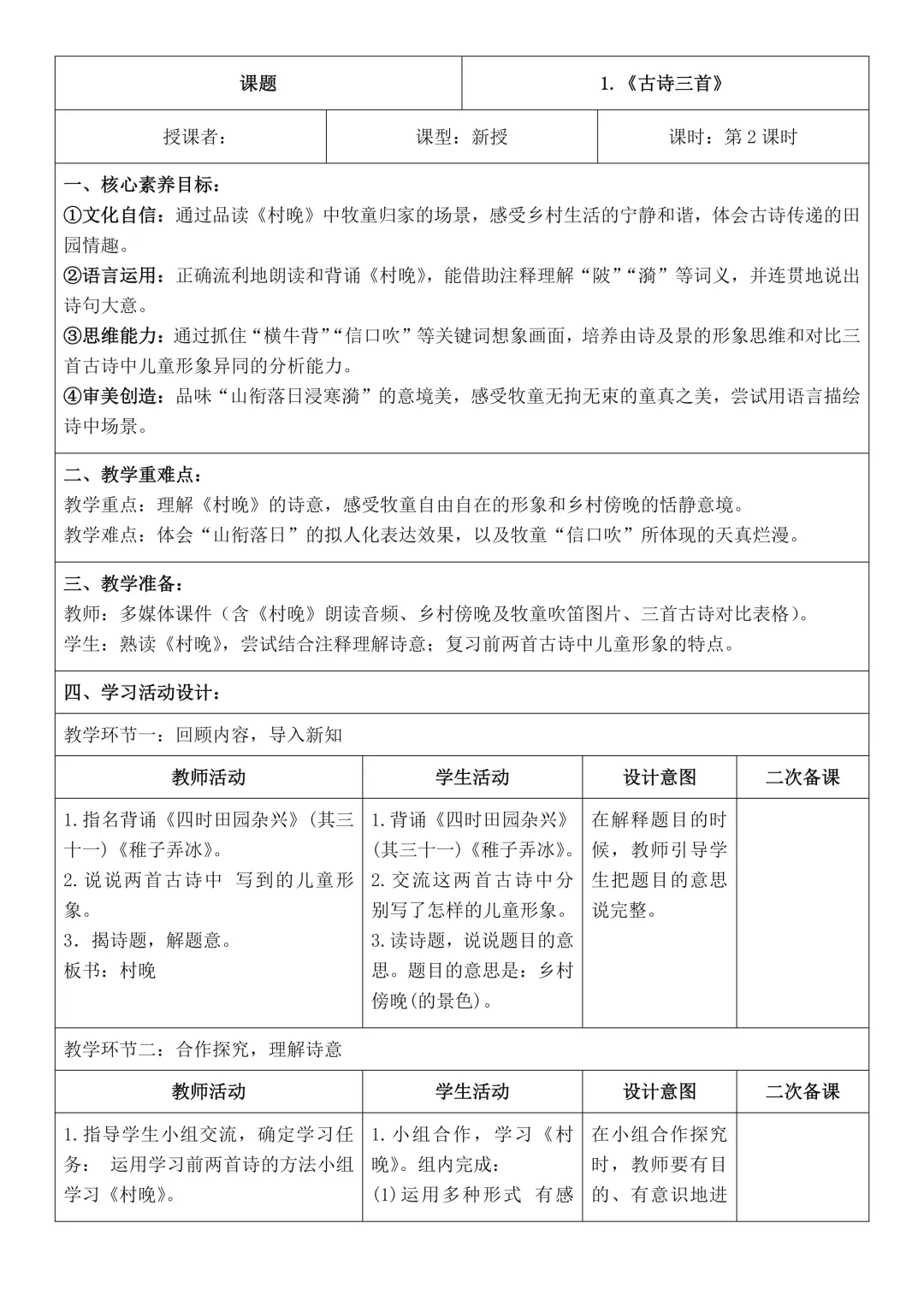 二年级下册语文全册核心素养教案表格版,有反思和无反思两个版本都包含