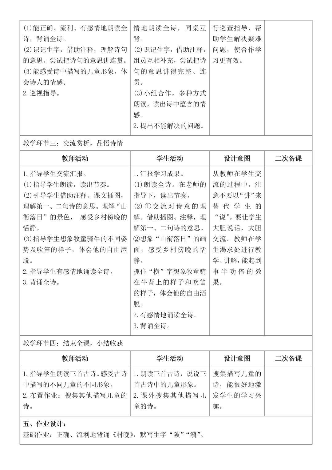 五年级下册语文全册核心素养教案表格版,有反思和无反思两个版本都包含