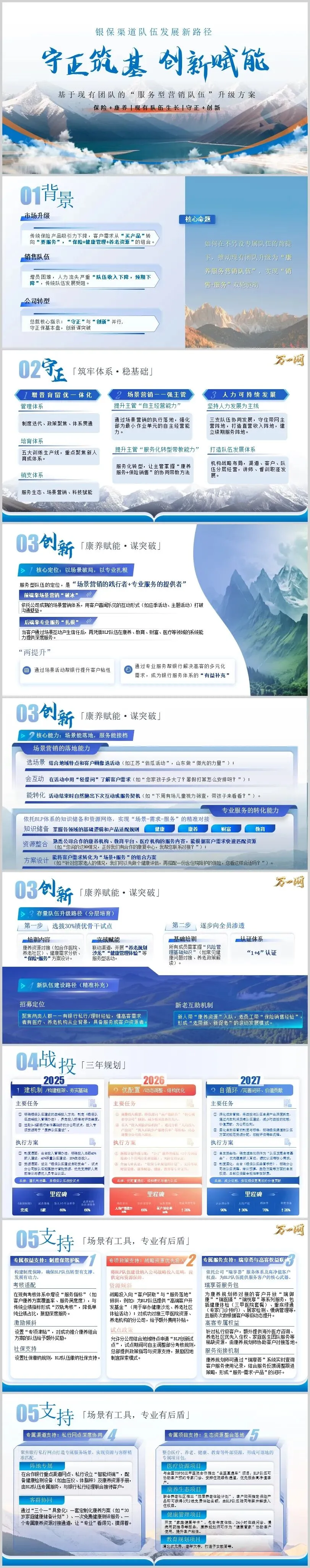 在银保市场升级的大背景下,现有团队的"服务型营销队伍"升级并非推倒重来,而是通过制度优化、能力重塑、场景激活,推动队伍从"单一销售者"向"综合服务提供者"转型。这一路径既守住了银行网点的主营阵地(带网)、拓展了直营收入来源(直营)、强化了续期服务粘性(续期),更通过"场景-需求-服务"的精准对接,真正满足了客户对保险价值的深层期待。未来,随着五大训练生产线的深耕、科技赋能的深化以及自主运营机制的完善,银保队伍有望成为连接保险保障与美好生活的一站式服务平台,为公司高质量发展注入新动能。