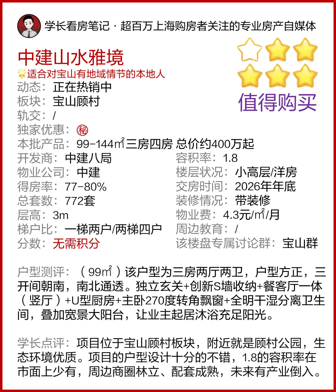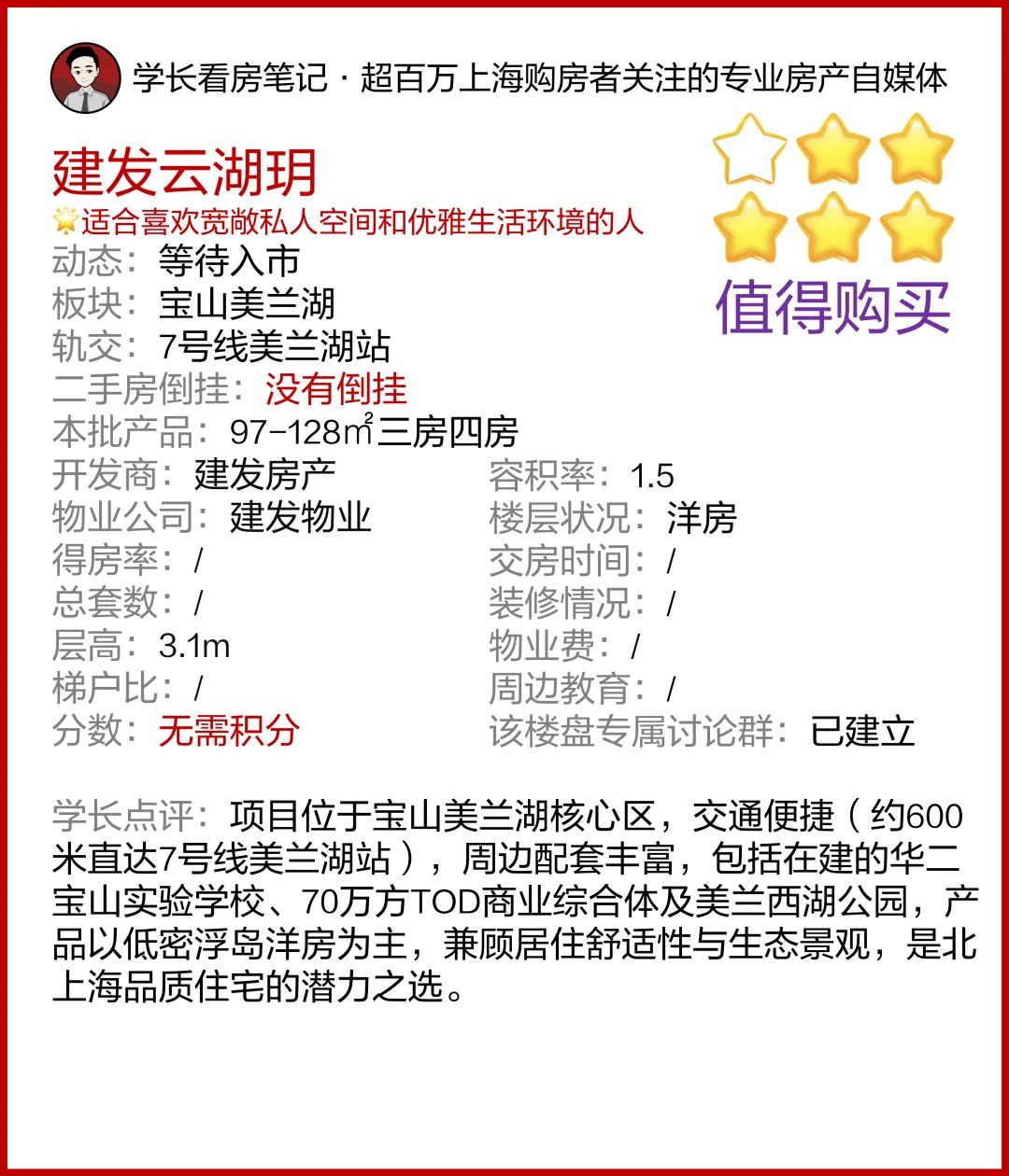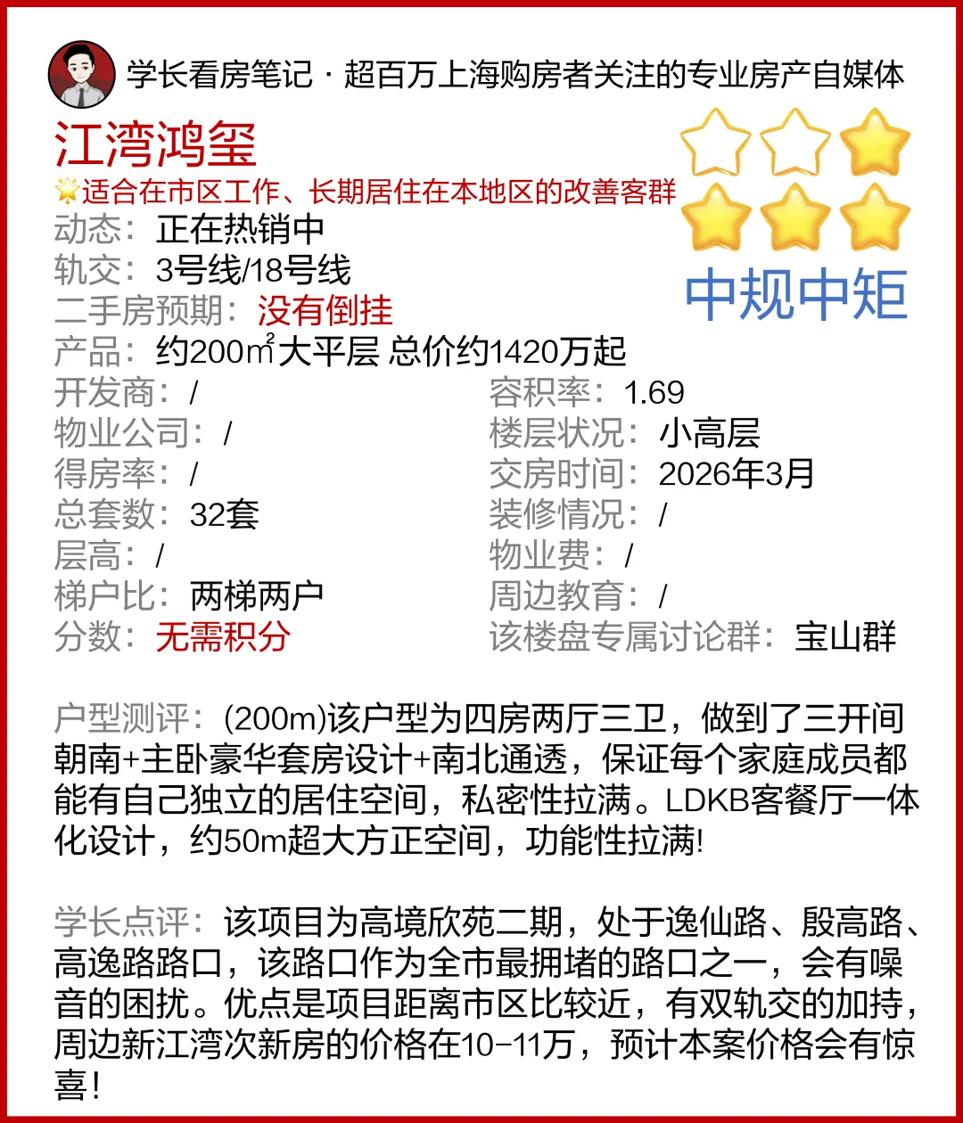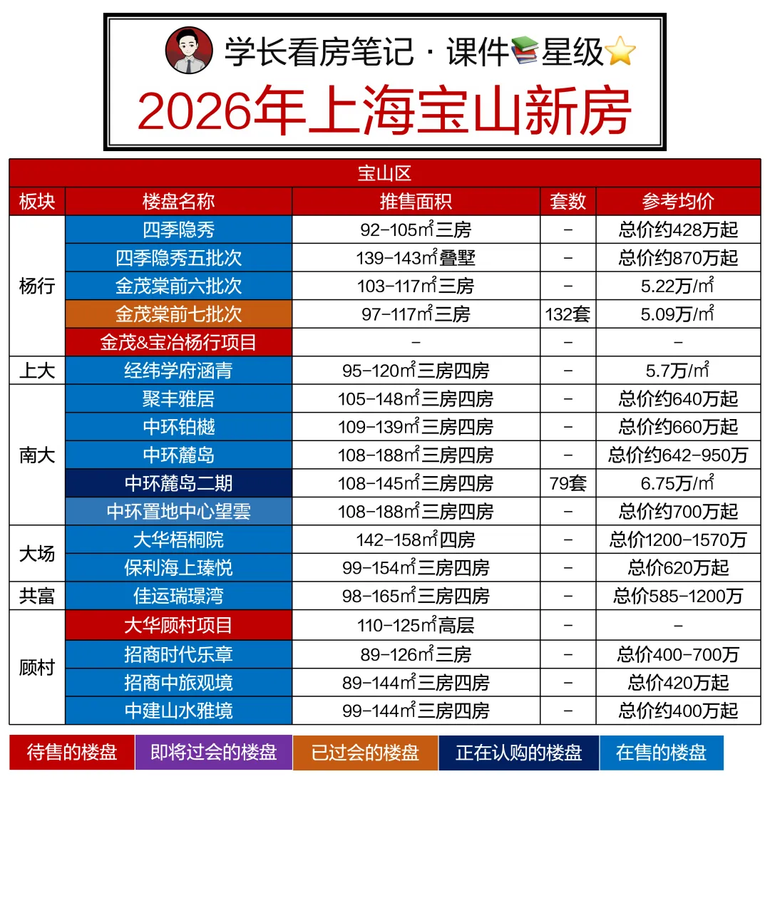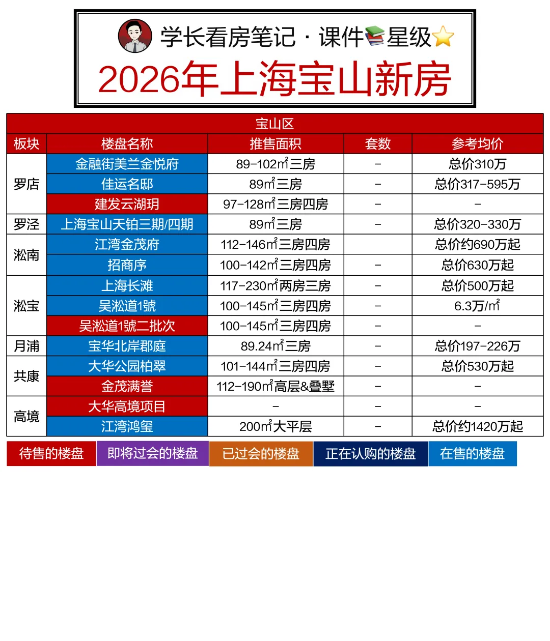 最新消息,样板间视频发布!宝山首个低密浮岛洋房项目「建发云湖玥」等待入市!建面约97-128㎡洋房!最新消息,紧邻18号线通南路站仅约50米!宝山淞南「江湾金茂府」五批次正在热销中!最新消息,宝山淞南「招商序」正在热销中!地铁上盖的这个中环项目再现神级户型,93%实得率,700万即可上车!最新消息:火热热销中!商业+现房+教育全面兑现!北上海滨江孤品「上海长滩」收官之作来了!用现房改写滨江生活门槛!最新消息,宝山淞宝「吴淞道1號」前期在售,二批次待加推!推出建面约100-145㎡三房四房!最新消息:宝山月浦「宝华北岸郡庭」正在热销中!推出建面约89.24㎡3房,总价约197万起!最新消息:咫尺静安!中环爆款出圈之作「大华·公园柏翠」正在热销中!推出建面约101-144㎡三房四房!最新消息,最新户型图发布!宝山再添品质标杆!「金茂满誉」等待入市!预计推出112-146㎡高层&150-190㎡叠墅!最新消息,宝山高境「江湾鸿玺」在售中!推出建面200㎡大平层,总价约1420万起!本课件为人工统计,如有错误,欢迎留言指正,当然,如果大家对课件的内容提升,有任何建议,或者,需要加入「宝山买房讨论群」,可以扫描下方二维码,诚挚感谢!