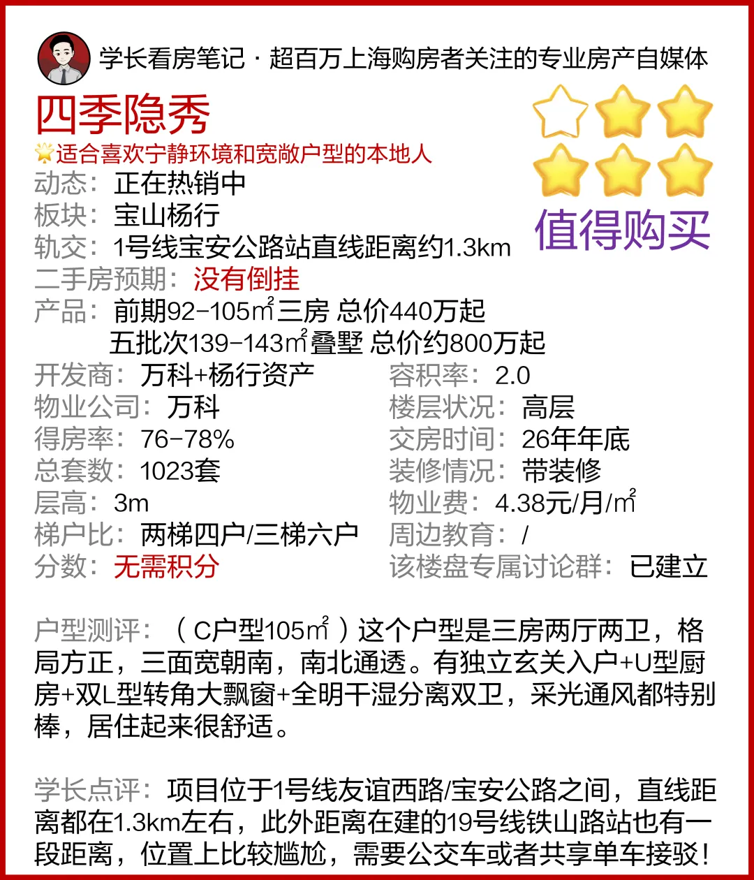 最新消息,宝山杨行「四季隐秀」正在热销中!在售建面约92-105㎡高层&139-143㎡叠墅,高层总价约440万起!最新消息,上海宝山站城TOD国际住区「金茂棠前」前期在售,七批次已过会,即将认购!推出建面约97-117㎡房源,均价50898元/㎡最新消息:宝山标杆之作!中环旁学府境「经纬·学府涵青」正在热销!