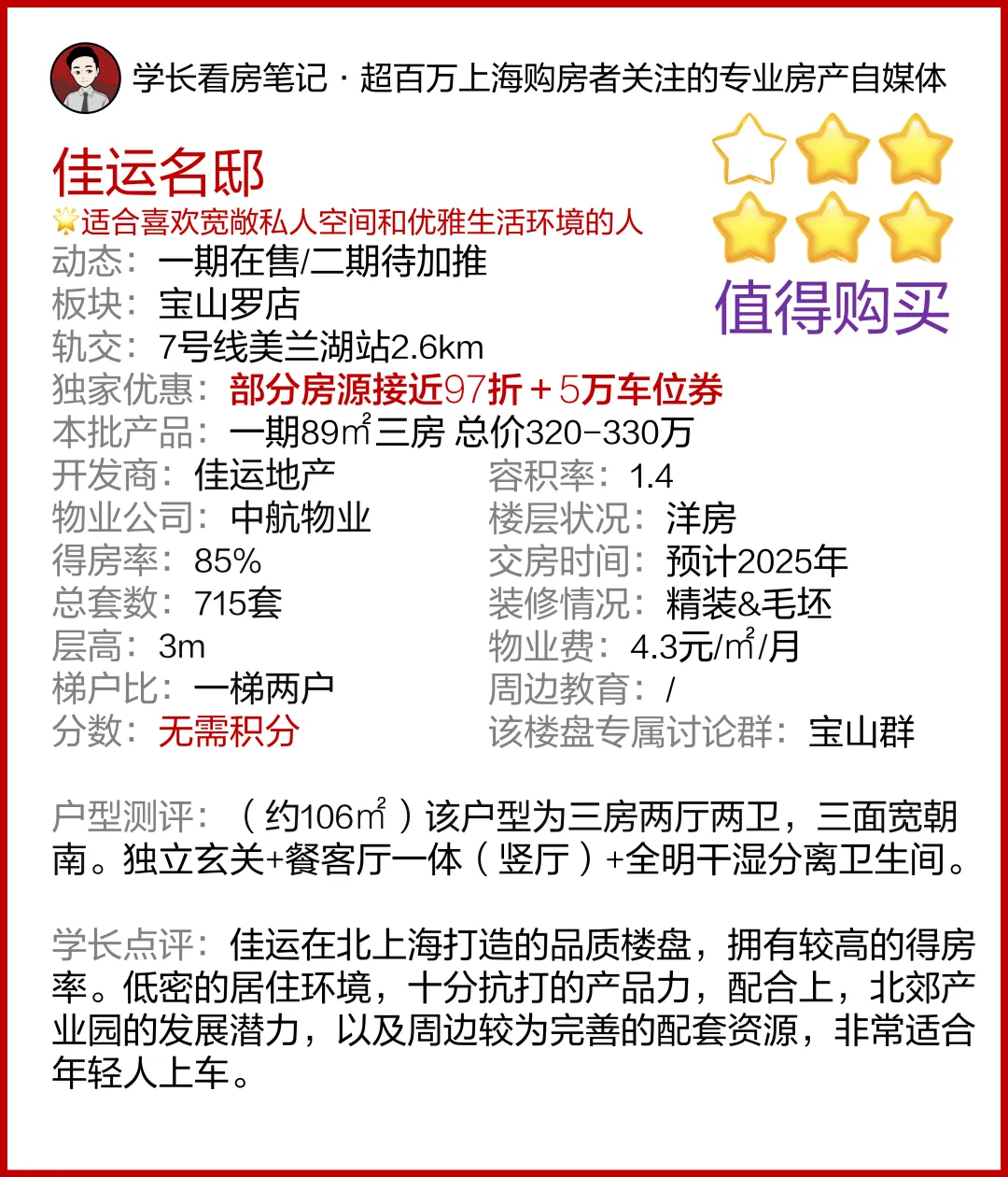 最新消息:宝山罗店板块全新盘「佳运名邸」一期正在热销中!在售面积约89㎡三房,总价320万起!欲了解详情可点击: