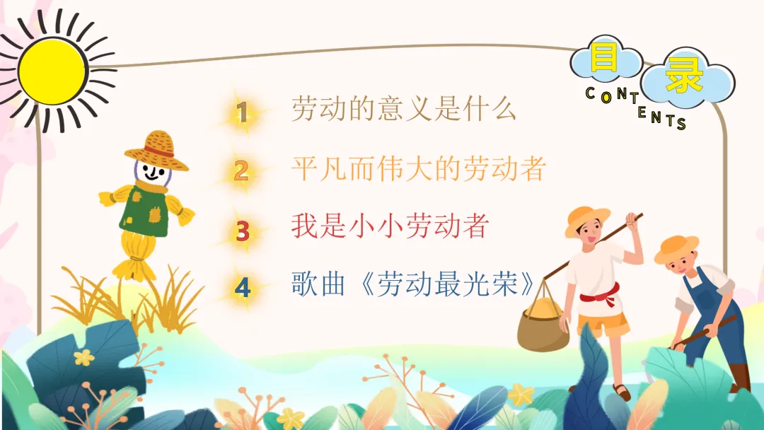 ○多媒体课件:包含劳动者图片、劳动相关视频、《劳动最光荣》歌曲音频/视频。