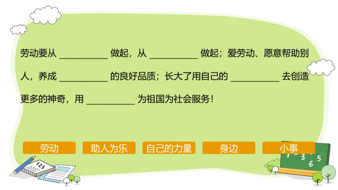 3.核心引导:劳动从来都不是一件小事,它需要我们从身边做起,从小事做起,养成爱劳动、助人为乐的好品质,长大后用自己的力量为祖国、为社会服务,创造更多的精彩。
