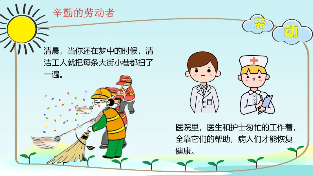 2.趣味提问:在生活中,你们见过哪些人在劳动呀?他们都在做什么呢?(鼓励学生自由发言,分享身边的劳动场景,如妈妈做饭、清洁工扫地、老师上课等)