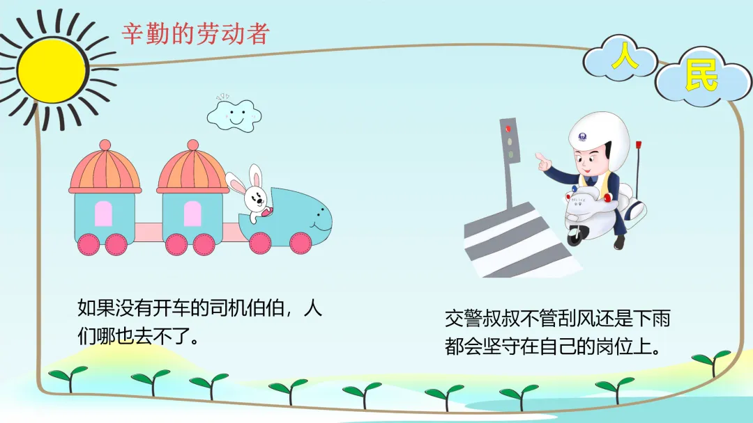 1.认识身边的劳动者:教师结合课件,依次介绍不同岗位的劳动者,配合图片讲解其工作内容和贡献: