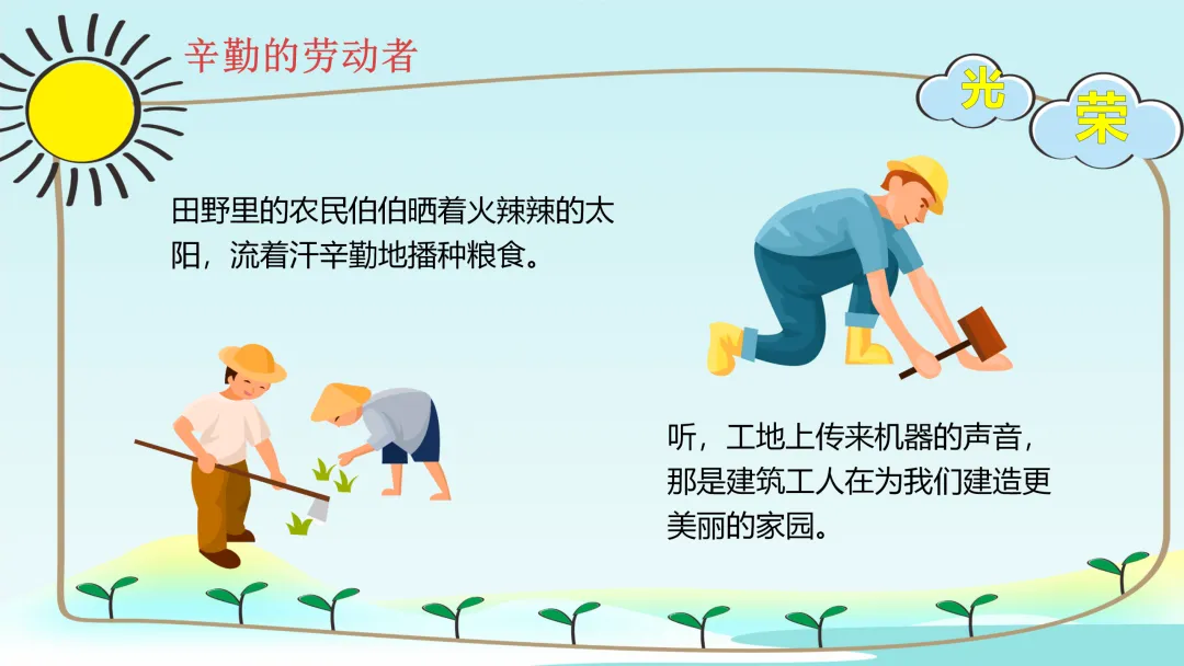 3.情感升华:教师小结:这些可爱的劳动者,没有惊天动地的壮举,却在自己的岗位上日复一日认真劳动。他们的汗水值得我们珍惜,他们的付出值得我们致敬,劳动的人,最光荣!